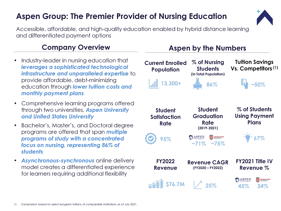 CONFIDENTIAL 2 Aspen Group: The Premier Provider of Nursing Education Accessible, affordable, and high - quality education enabled by hybrid distance learning and differentiated payment options Industry - leader in nursing education that leverages a sophisticated technological infrastructure and unparalleled expertise to provide affordable, debt - minimizing education through lower tuition costs and monthly payment plans Comprehensive learning programs offered through two universities, Aspen University and United States University Bachelor’s, Master’s, and Doctoral degree programs are offered that span multiple programs of study with a concentrated focus on nursing, representing 86% of students Asynchronous - synchronous online delivery model creates a differentiated experience for learners requiring additional flexibility Company Overview Aspen by the Numbers 1) Comparison based on select program tuitions of comparable institutions as of July 2021. Current Enrolled Population FY2022 Revenue $76.7M Student Satisfaction Rate 95% 13,300+ Revenue CAGR (FY2020 – FY2022) 25% % of Nursing Students (in Total Population) 86% Student Graduation Rate (2019 - 2021) ~71% ~75% FY2021 Title IV Revenue % % of Students Using Payment Plans 67% 45% 34% Tuition Savings Vs. Competitors (1) ~50%