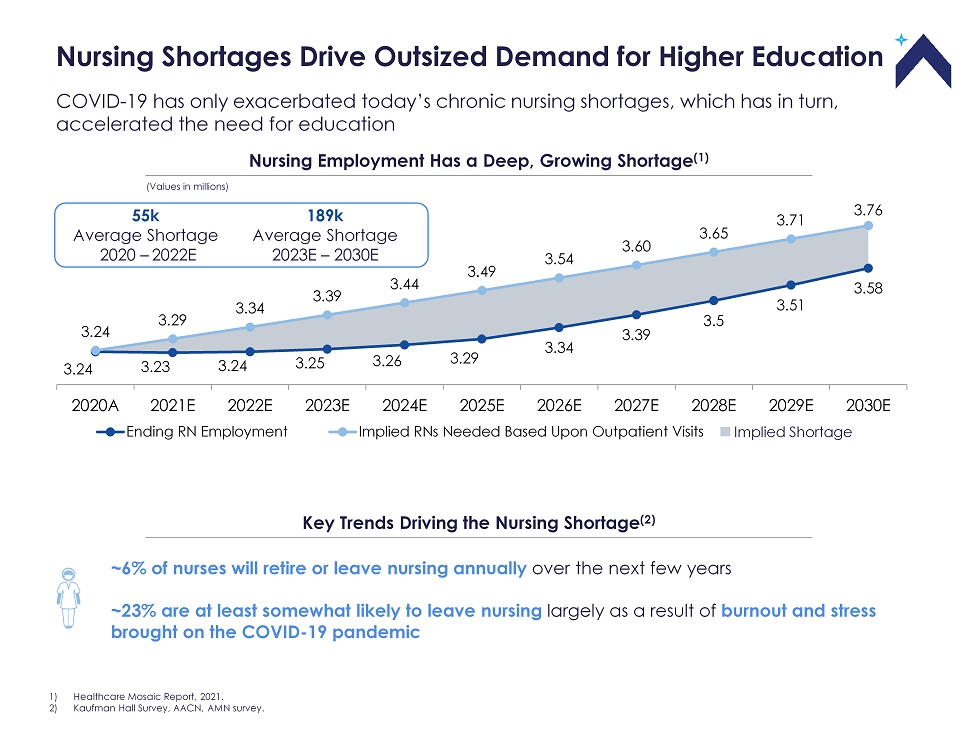 CONFIDENTIAL 3 3.24 3.23 3.24 3.25 3.26 3.29 3.34 3.39 3.5 3.51 3.58 3.24 3.29 3.34 3.39 3.44 3.49 3.54 3.60 3.65 3.71 3.76 2020A 2021E 2022E 2023E 2024E 2025E 2026E 2027E 2028E 2029E 2030E Ending RN Employment Implied RNs Needed Based Upon Outpatient Visits COVID - 19 has only exacerbated today’s chronic nursing shortages, which has in turn, accelerated the need for education Nursing Shortages Drive Outsized Demand for Higher Education 55k Average Shortage 2020 – 2022E 189k Average Shortage 2023E – 2030E Implied Shortage ~6% of nurses will retire or leave nursing annually over the next few years ~23% are at least somewhat likely to leave nursing largely as a result of burnout and stress brought on the COVID - 19 pandemic Nursing Employment Has a Deep, Growing Shortage (1) (Values in millions) Key Trends Driving the Nursing Shortage (2) 1) Healthcare Mosaic Report, 2021. 2) Kaufman Hall Survey, AACN, AMN survey.