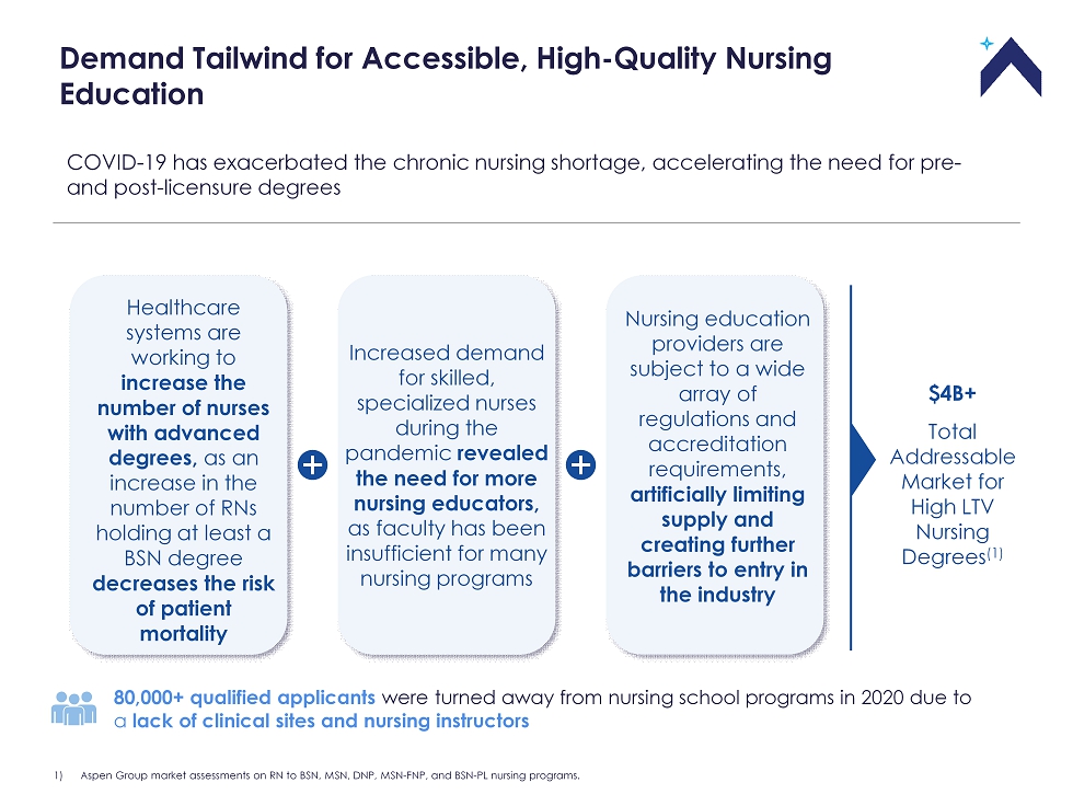 CONFIDENTIAL 4 COVID - 19 has exacerbated the chronic nursing shortage, accelerating the need for pre - and post - licensure degrees Demand Tailwind for Accessible, High - Quality Nursing Education 1) Aspen Group market assessments on RN to BSN, MSN, DNP, MSN - FNP, and BSN - PL nursing programs. Increased demand for skilled, specialized nurses during the pandemic revealed the need for more nursing educators, as faculty has been insufficient for many nursing programs Nursing education providers are subject to a wide array of regulations and accreditation requirements, artificially limiting supply and creating further barriers to entry in the industry Healthcare systems are working to increase the number of nurses with advanced degrees, as an increase in the number of RNs holding at least a BSN degree decreases the risk of patient mortality $4B+ Total Addressable Market for High LTV Nursing Degrees (1) 80,000+ qualified applicants were turned away from nursing school programs in 2020 due to a lack of clinical sites and nursing instructors