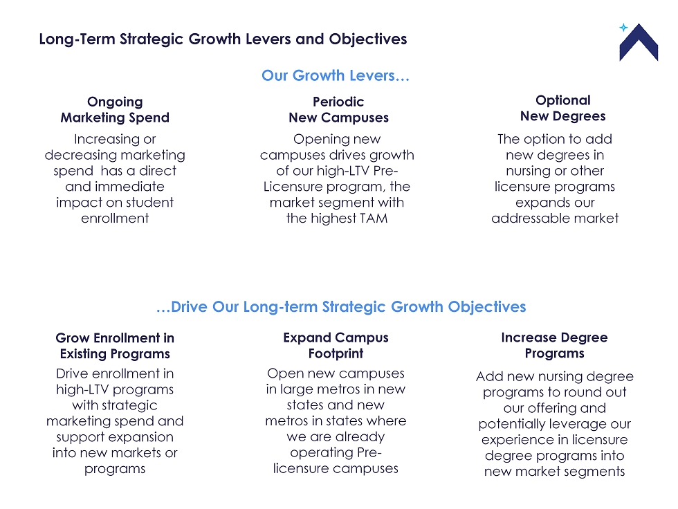 CONFIDENTIAL 5 Our Growth Levers… Long - Term Strategic Growth Levers and Objectives Ongoing Marketing Spend Periodic New Campuses Optional New Degrees Increasing or decreasing marketing spend has a direct and immediate impact on student enrollment Opening new campuses drives growth of our high - LTV Pre - Licensure program, the market segment with the highest TAM The option to add new degrees in nursing or other licensure programs expands our addressable market …Drive Our Long - term Strategic Growth Objectives Grow Enrollment in Existing Programs Expand Campus Footprint Increase Degree Programs Drive enrollment in high - LTV programs with strategic marketing spend and support expansion into new markets or programs Open new campuses in large metros in new states and new metros in states where we are already operating Pre - licensure campuses Add new nursing degree programs to round out our offering and potentially leverage our experience in licensure degree programs into new market segments