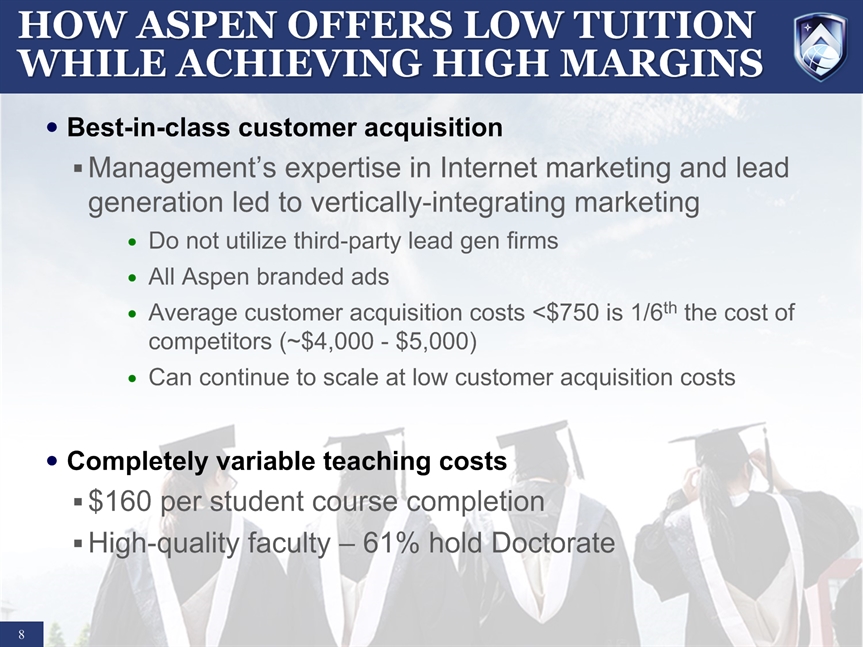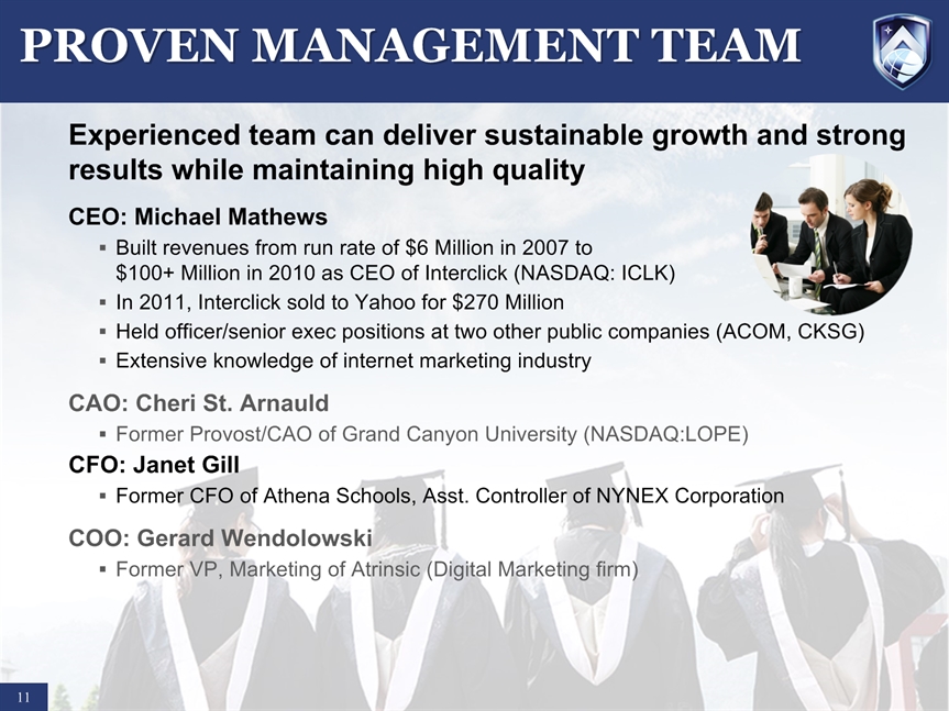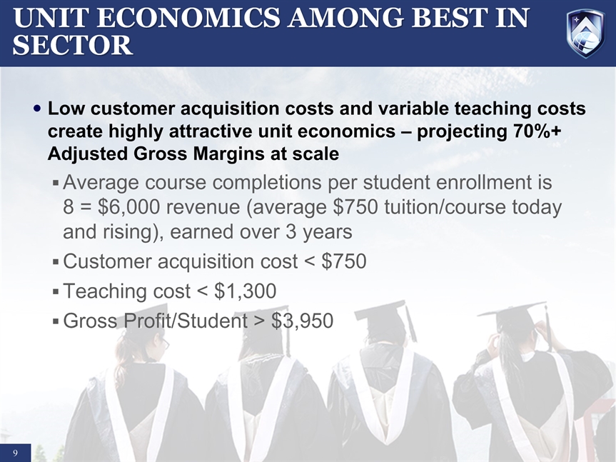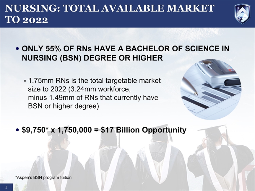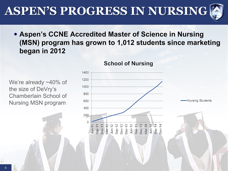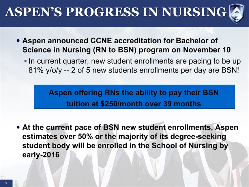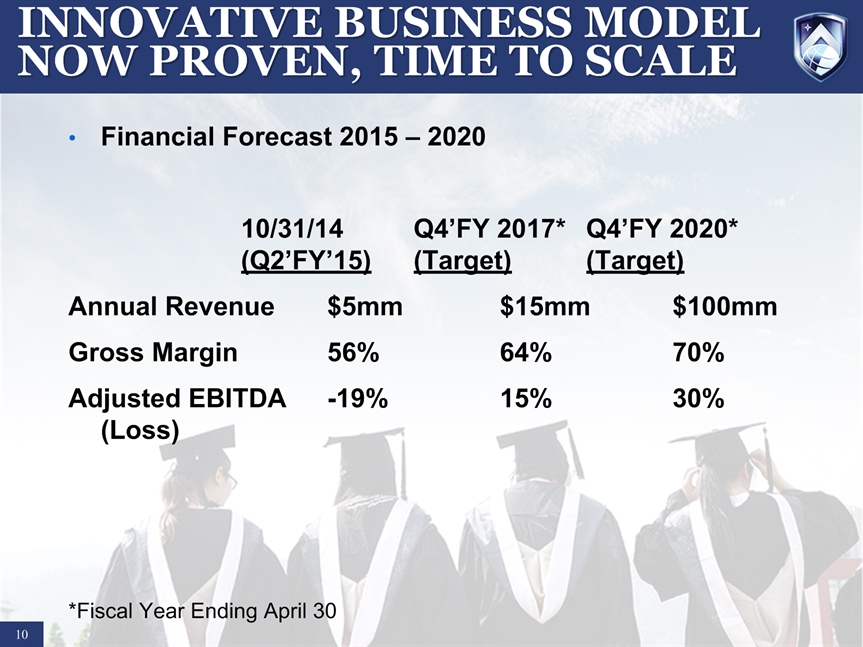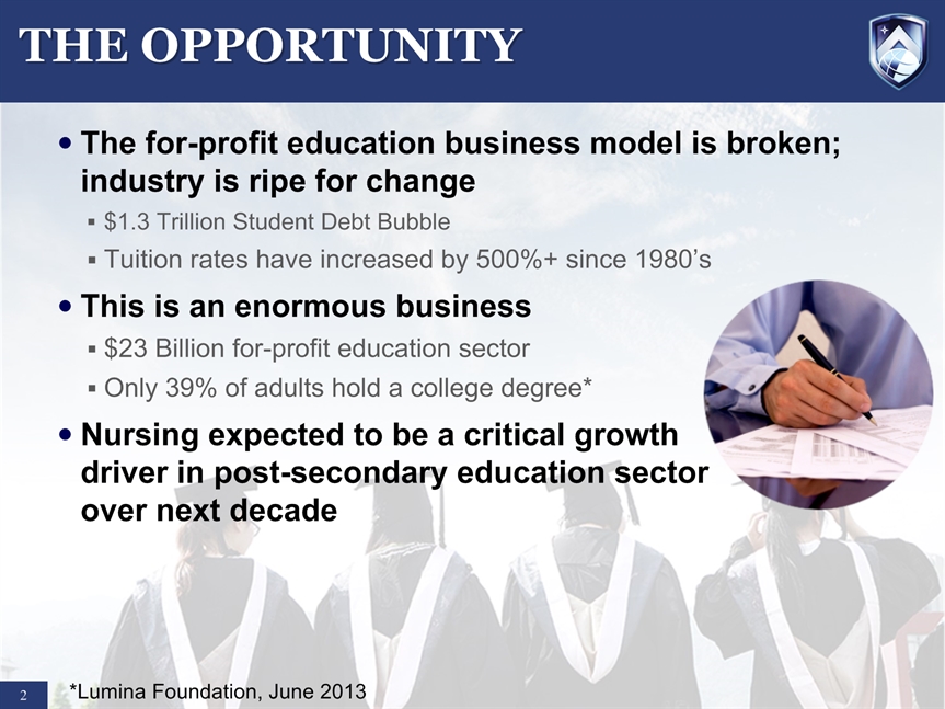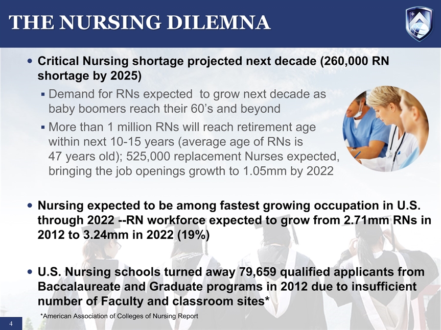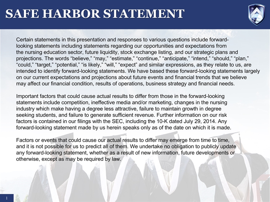 SAFE HARBOR STATEMENT * Certain statements in this presentation and responses to various questions include forward-looking statements including statements regarding our opportunities and expectations from the nursing education sector, future liquidity, stock exchange listing, and our strategic plans and projections. The words “believe,” “may,” “estimate,” “continue,” “anticipate,” “intend,” “should,” “plan,” “could,” “target,” “potential,” “is likely,” “will,” “expect” and similar expressions, as they relate to us, are intended to identify forward-looking statements. We have based these forward-looking statements largely on our current expectations and projections about future events and financial trends that we believe may affect our financial condition, results of operations, business strategy and financial needs. Important factors that could cause actual results to differ from those in the forward-looking statements include competition, ineffective media and/or marketing, changes in the nursing industry which make having a degree less attractive, failure to maintain growth in degree seeking students, and failure to generate sufficient revenue. Further information on our risk factors is contained in our filings with the SEC, including the 10-K dated July 29, 2014. Any forward-looking statement made by us herein speaks only as of the date on which it is made. Factors or events that could cause our actual results to differ may emerge from time to time, and it is not possible for us to predict all of them. We undertake no obligation to publicly update any forward-looking statement, whether as a result of new information, future developments or otherwise, except as may be required by law.