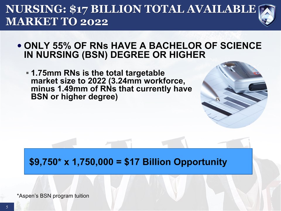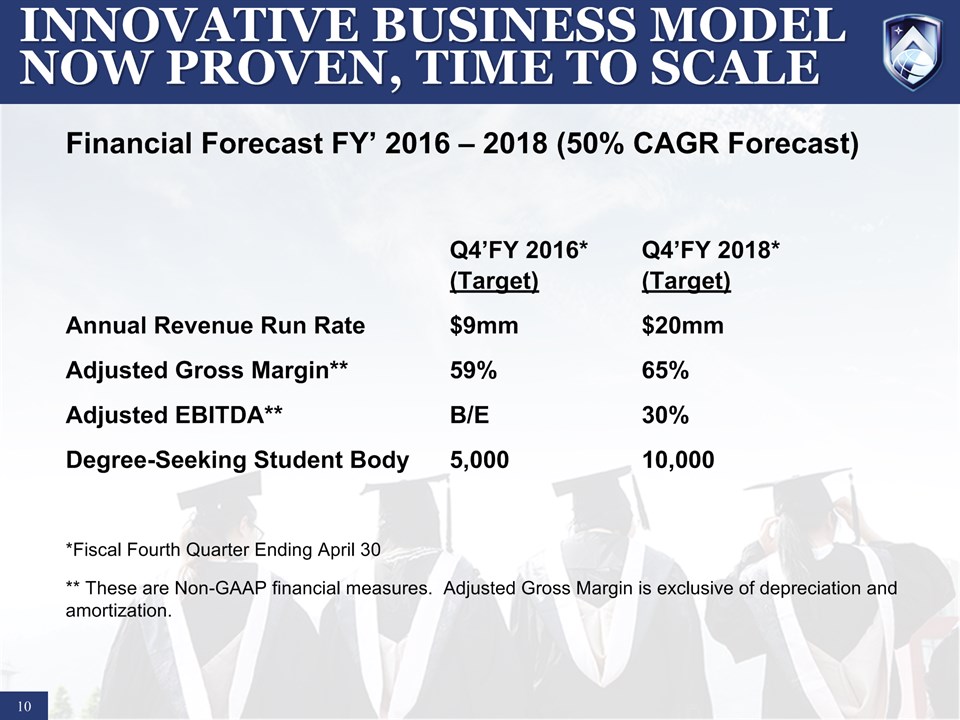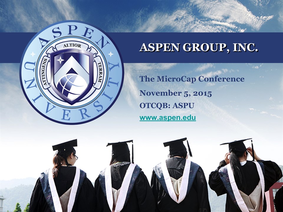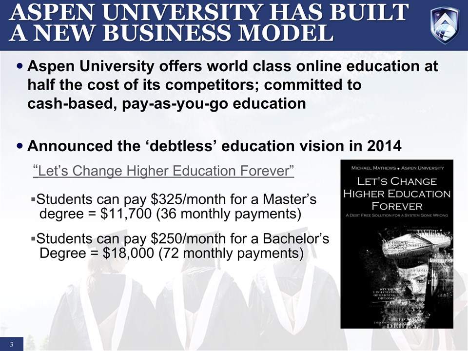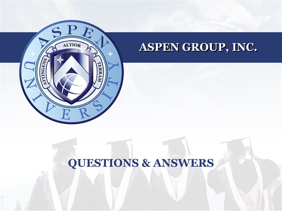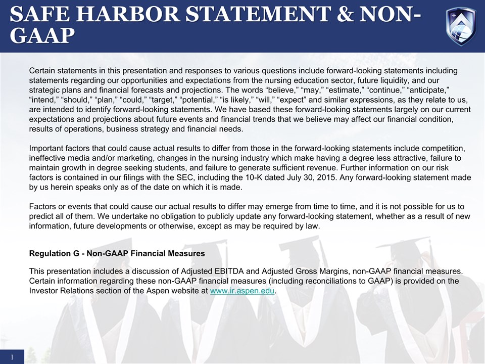 SAFE HARBOR STATEMENT & NON-GAAP * Certain statements in this presentation and responses to various questions include forward-looking statements including statements regarding our opportunities and expectations from the nursing education sector, future liquidity, and our strategic plans and financial forecasts and projections. The words “believe,” “may,” “estimate,” “continue,” “anticipate,” “intend,” “should,” “plan,” “could,” “target,” “potential,” “is likely,” “will,” “expect” and similar expressions, as they relate to us, are intended to identify forward-looking statements. We have based these forward-looking statements largely on our current expectations and projections about future events and financial trends that we believe may affect our financial condition, results of operations, business strategy and financial needs. Important factors that could cause actual results to differ from those in the forward-looking statements include competition, ineffective media and/or marketing, changes in the nursing industry which make having a degree less attractive, failure to maintain growth in degree seeking students, and failure to generate sufficient revenue. Further information on our risk factors is contained in our filings with the SEC, including the 10-K dated July 30, 2015. Any forward-looking statement made by us herein speaks only as of the date on which it is made. Factors or events that could cause our actual results to differ may emerge from time to time, and it is not possible for us to predict all of them. We undertake no obligation to publicly update any forward-looking statement, whether as a result of new information, future developments or otherwise, except as may be required by law.Regulation G - Non-GAAP Financial Measures This presentation includes a discussion of Adjusted EBITDA and Adjusted Gross Margins, non-GAAP financial measures. Certain information regarding these non-GAAP financial measures (including reconciliations to GAAP) is provided on the Investor Relations section of the Aspen website at www.ir.aspen.edu.