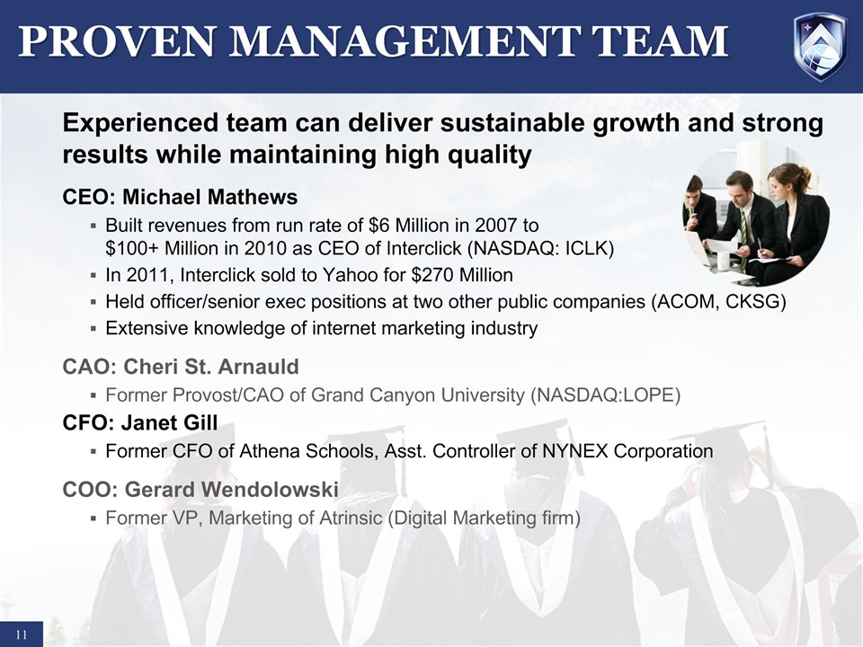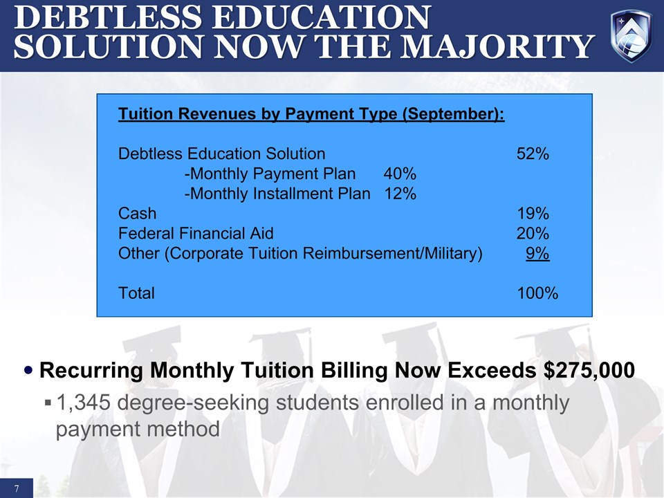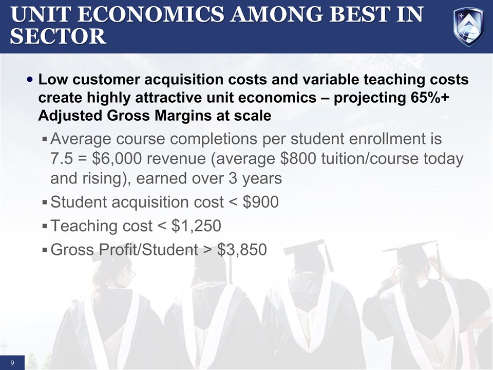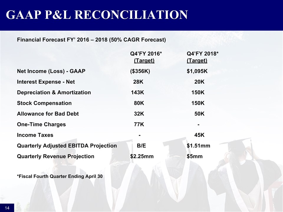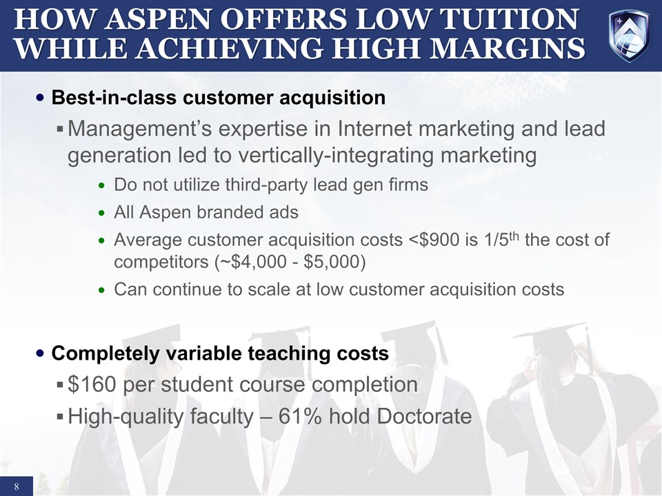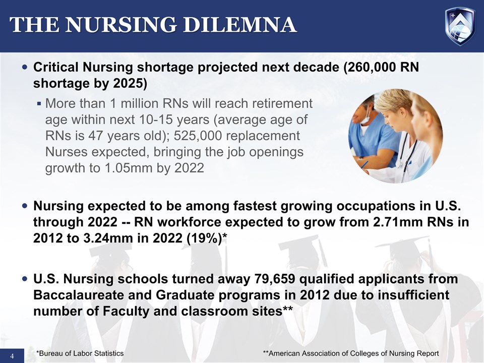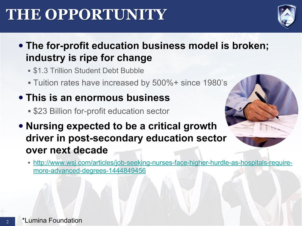 SAFE HARBOR STATEMENT & NON-GAAP * Certain statements in this presentation and responses to various questions include forward-looking statements including statements regarding our opportunities and expectations from the nursing education sector, future liquidity, and our strategic plans and financial forecasts and projections. The words “believe,” “may,” “estimate,” “continue,” “anticipate,” “intend,” “should,” “plan,” “could,” “target,” “potential,” “is likely,” “will,” “expect” and similar expressions, as they relate to us, are intended to identify forward-looking statements. We have based these forward-looking statements largely on our current expectations and projections about future events and financial trends that we believe may affect our financial condition, results of operations, business strategy and financial needs. Important factors that could cause actual results to differ from those in the forward-looking statements include competition, ineffective media and/or marketing, changes in the nursing industry which make having a degree less attractive, failure to maintain growth in degree seeking students, and failure to generate sufficient revenue. Further information on our risk factors is contained in our filings with the SEC, including the 10-K dated July 30, 2015. Any forward-looking statement made by us herein speaks only as of the date on which it is made. Factors or events that could cause our actual results to differ may emerge from time to time, and it is not possible for us to predict all of them. We undertake no obligation to publicly update any forward-looking statement, whether as a result of new information, future developments or otherwise, except as may be required by law.Regulation G - Non-GAAP Financial Measures This presentation includes a discussion of Adjusted EBITDA and Adjusted Gross Margins, non-GAAP financial measures. Certain information regarding these non-GAAP financial measures (including reconciliations to GAAP) is provided on the Investor Relations section of the Aspen website at www.ir.aspen.edu.