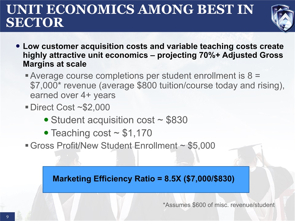UNIT ECONOMICS AMONG BEST IN SECTOR  9  Low customer acquisition costs and variable teaching costs create highly attractive unit economics – projecting 70%+ Adjusted Gross Margins at scaleAverage course completions per student enrollment is 8 = $7,000* revenue (average $800 tuition/course today and rising), earned over 4+ yearsDirect Cost ~$2,000Student acquisition cost ~ $830 Teaching cost ~ $1,170Gross Profit/New Student Enrollment ~ $5,000 *Assumes $600 of misc. revenue/student  Marketing Efficiency Ratio = 8.5X ($7,000/$830)