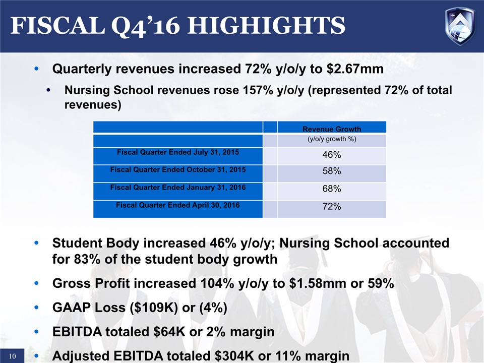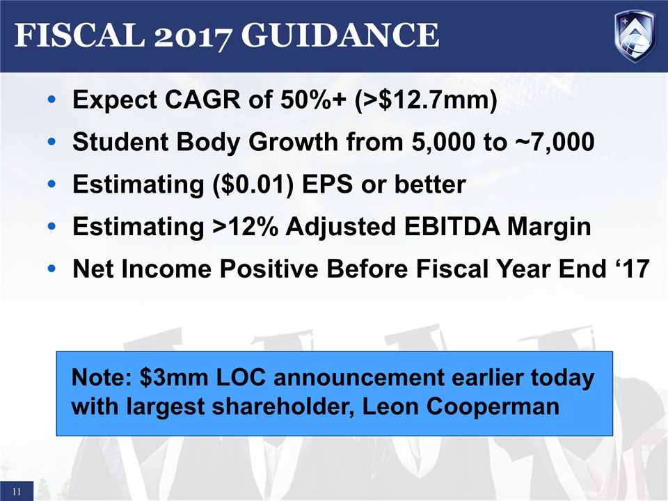 FISCAL Q4’16 HIGHIGHTS  10  Quarterly revenues increased 72% y/o/y to $2.67mmNursing School revenues rose 157% y/o/y (represented 72% of total revenues)Student Body increased 46% y/o/y; Nursing School accounted for 83% of the student body growthGross Profit increased 104% y/o/y to $1.58mm or 59%GAAP Loss ($109K) or (4%)EBITDA totaled $64K or 2% marginAdjusted EBITDA totaled $304K or 11% margin         Revenue Growth        (y/o/y growth %)  Fiscal Quarter Ended July 31, 2015         46%  Fiscal Quarter Ended October 31, 2015     58%  Fiscal Quarter Ended January 31, 2016     68%  Fiscal Quarter Ended April 30, 2016     72%