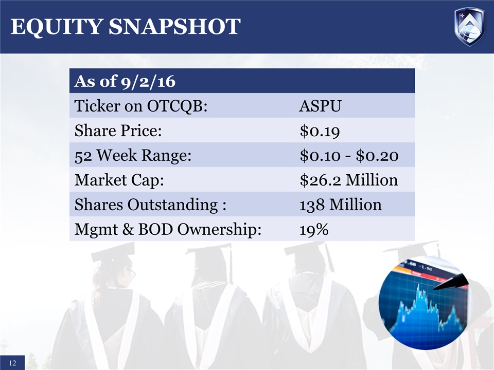 EQUITY SNAPSHOT   12  As of 9/2/16    Ticker on OTCQB:  ASPU  Share Price:  $0.19  52 Week Range:  $0.10 - $0.20  Market Cap:  $26.2 Million  Shares Outstanding :  138 Million  Mgmt & BOD Ownership:  19%