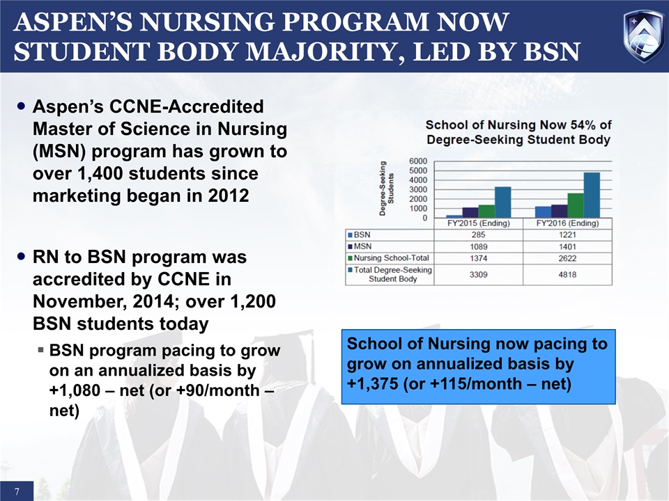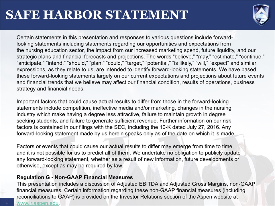 SAFE HARBOR STATEMENT  1  Certain statements in this presentation and responses to various questions include forward-looking statements including statements regarding our opportunities and expectations from the nursing education sector, the impact from our increased marketing spend, future liquidity, and our strategic plans and financial forecasts and projections. The words “believe,” “may,” “estimate,” “continue,” “anticipate,” “intend,” “should,” “plan,” “could,” “target,” “potential,” “is likely,” “will,” “expect” and similar expressions, as they relate to us, are intended to identify forward-looking statements. We have based these forward-looking statements largely on our current expectations and projections about future events and financial trends that we believe may affect our financial condition, results of operations, business strategy and financial needs. Important factors that could cause actual results to differ from those in the forward-looking statements include competition, ineffective media and/or marketing, changes in the nursing industry which make having a degree less attractive, failure to maintain growth in degree seeking students, and failure to generate sufficient revenue. Further information on our risk factors is contained in our filings with the SEC, including the 10-K dated July 27, 2016. Any forward-looking statement made by us herein speaks only as of the date on which it is made. Factors or events that could cause our actual results to differ may emerge from time to time, and it is not possible for us to predict all of them. We undertake no obligation to publicly update any forward-looking statement, whether as a result of new information, future developments or otherwise, except as may be required by law.Regulation G - Non-GAAP Financial Measures  This presentation includes a discussion of Adjusted EBITDA and Adjusted Gross Margins, non-GAAP financial measures. Certain information regarding these non-GAAP financial measures (including reconciliations to GAAP) is provided on the Investor Relations section of the Aspen website at www.ir.aspen.edu.