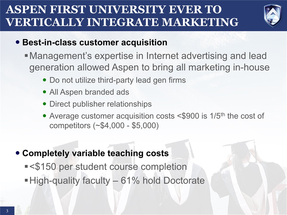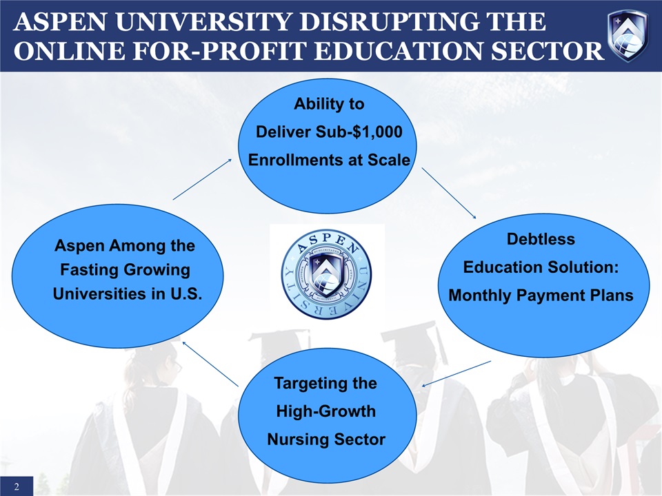 ASPEN UNIVERSITY DISRUPTING THE ONLINE FOR-PROFIT EDUCATION SECTOR  2  Debtless Education Solution:Monthly Payment Plans  Targeting the High-GrowthNursing Sector  Ability to Deliver Sub-$1,000 Enrollments at Scale  Aspen Among the Fasting GrowingUniversities in U.S.