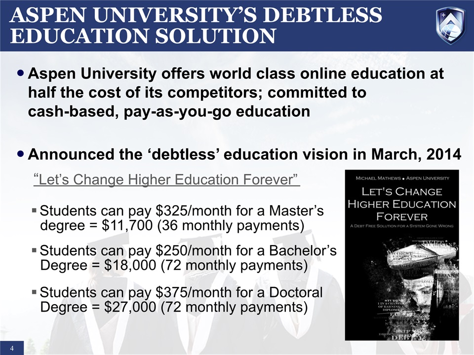 ASPEN FIRST UNIVERSITY EVER TO VERTICALLY INTEGRATE MARKETING  3  Best-in-class customer acquisitionManagement’s expertise in Internet advertising and lead generation allowed Aspen to bring all marketing in-houseDo not utilize third-party lead gen firmsAll Aspen branded adsDirect publisher relationshipsAverage customer acquisition costs <$900 is 1/5th the cost of competitors (~$4,000 - $5,000)Completely variable teaching costs<$150 per student course completionHigh-quality faculty – 61% hold Doctorate