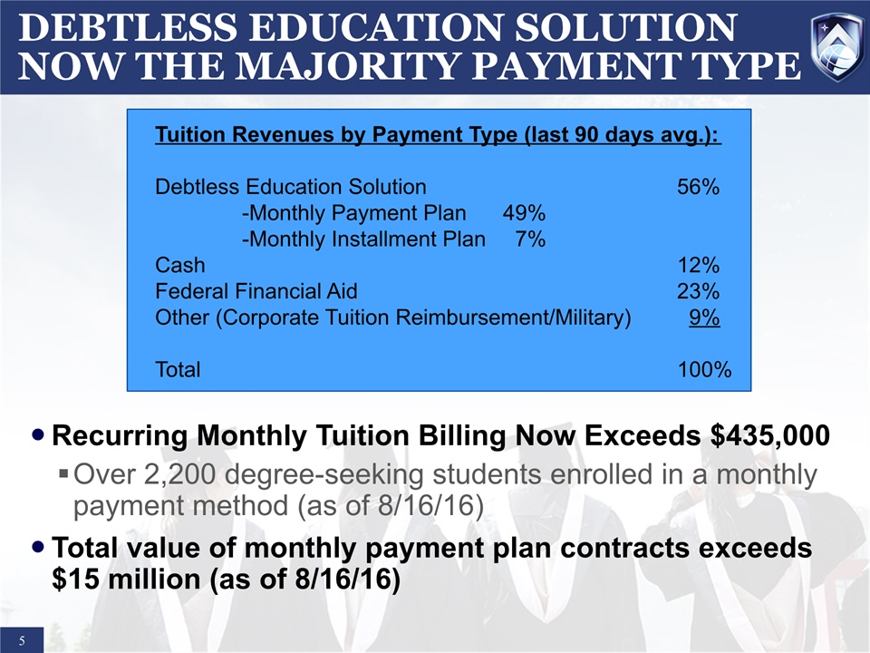 ASPEN UNIVERSITY’S DEBTLESSEDUCATION SOLUTION  4  Aspen University offers world class online education at half the cost of its competitors; committed to cash-based, pay-as-you-go educationAnnounced the ‘debtless’ education vision in March, 2014 “Let’s Change Higher Education Forever” Students can pay $325/month for a Master’s degree = $11,700 (36 monthly payments)Students can pay $250/month for a Bachelor’s Degree = $18,000 (72 monthly payments)Students can pay $375/month for a Doctoral Degree = $27,000 (72 monthly payments)