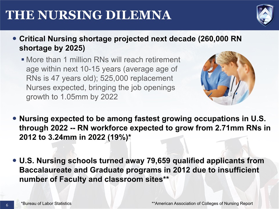 THE NURSING DILEMNA  6  Critical Nursing shortage projected next decade (260,000 RN shortage by 2025)More than 1 million RNs will reach retirement age within next 10-15 years (average age of RNs is 47 years old); 525,000 replacement Nurses expected, bringing the job openings growth to 1.05mm by 2022Nursing expected to be among fastest growing occupations in U.S. through 2022 -- RN workforce expected to grow from 2.71mm RNs in 2012 to 3.24mm in 2022 (19%)*U.S. Nursing schools turned away 79,659 qualified applicants from Baccalaureate and Graduate programs in 2012 due to insufficient number of Faculty and classroom sites***Bureau of Labor Statistics **American Association of Colleges of Nursing Report