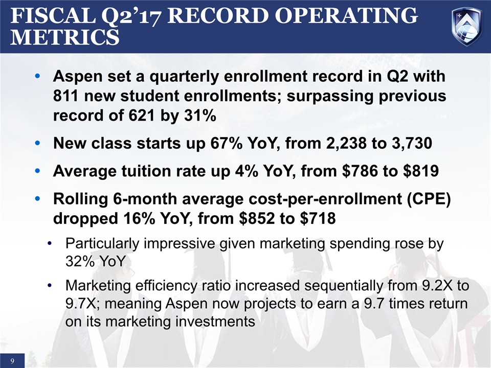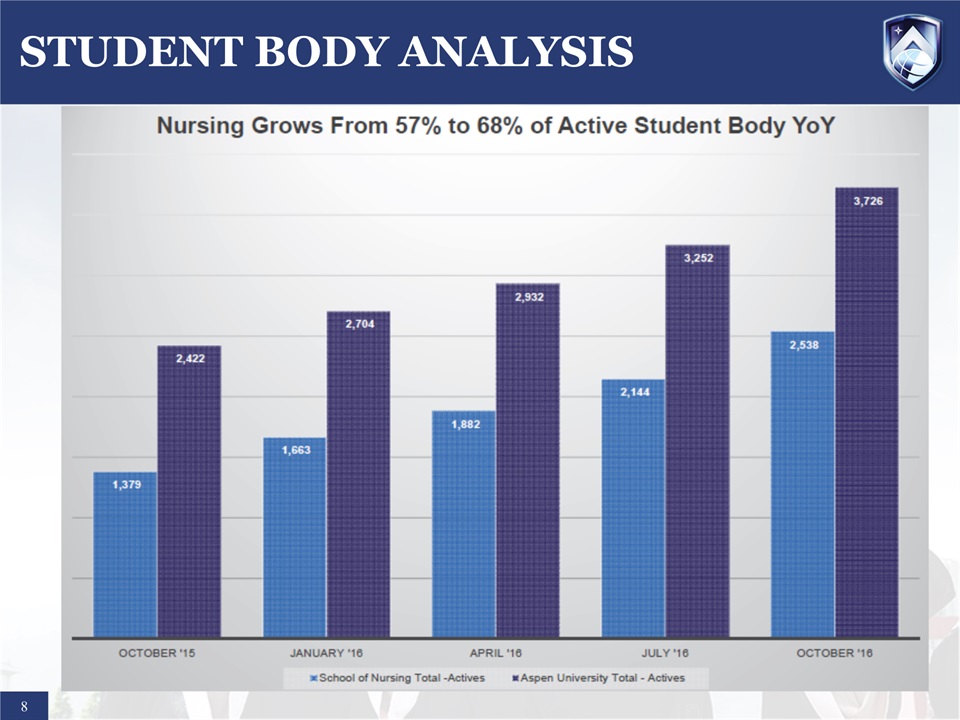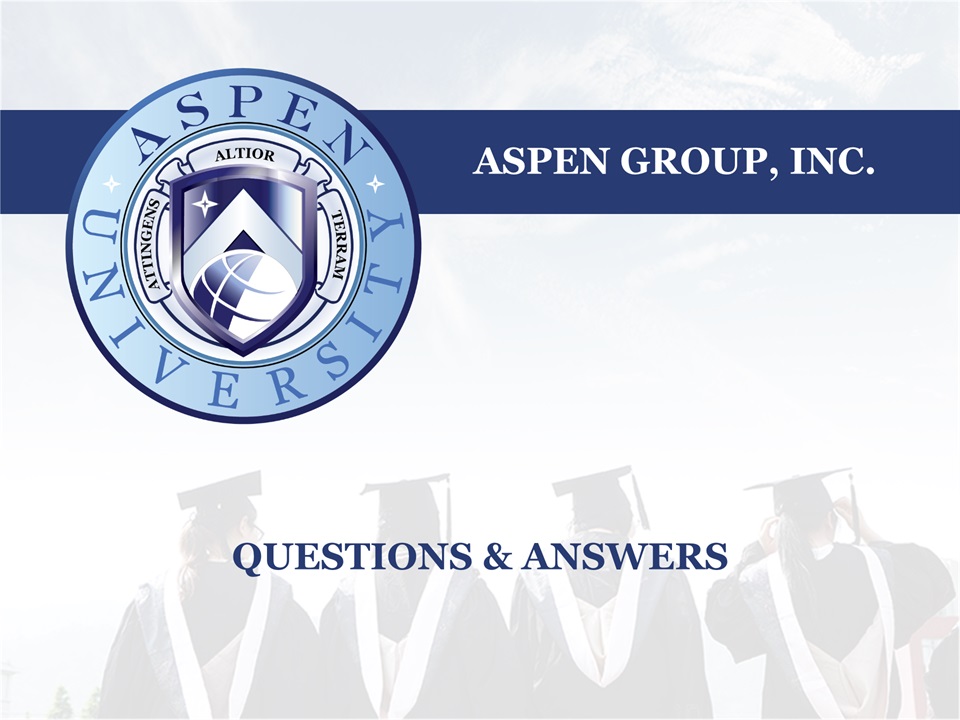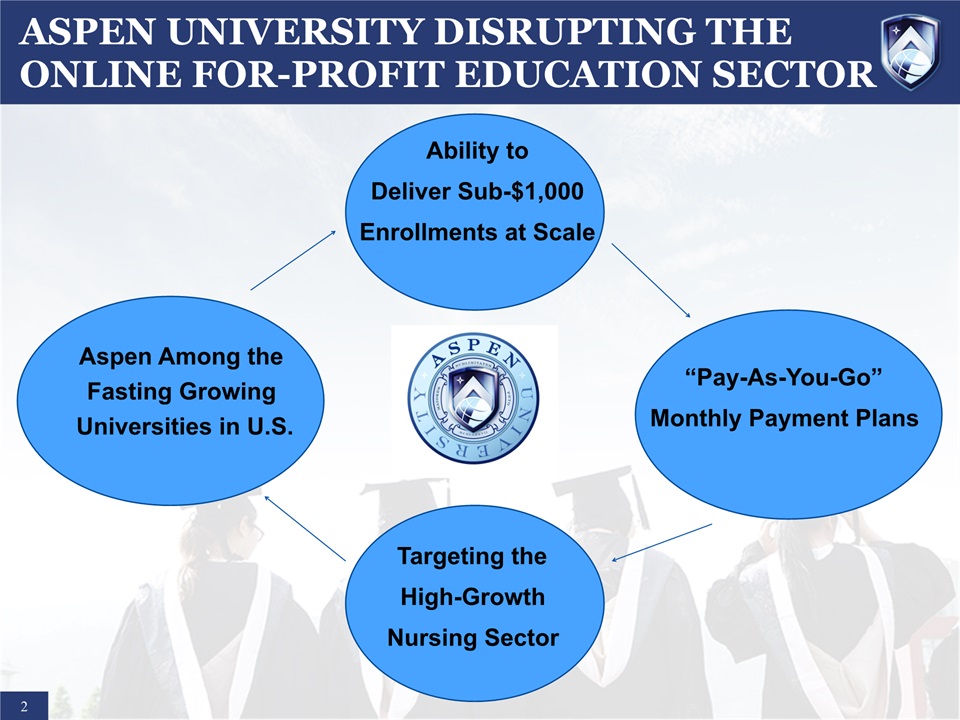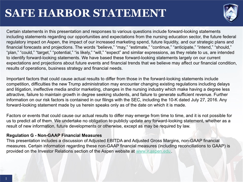 SAFE HARBOR STATEMENT  1  Certain statements in this presentation and responses to various questions include forward-looking statements including statements regarding our opportunities and expectations from the nursing education sector, the future federal regulatory impact on Aspen, the impact of our increased marketing spend, future liquidity, and our strategic plans and financial forecasts and projections. The words “believe,” “may,” “estimate,” “continue,” “anticipate,” “intend,” “should,” “plan,” “could,” “target,” “potential,” “is likely,” “will,” “expect” and similar expressions, as they relate to us, are intended to identify forward-looking statements. We have based these forward-looking statements largely on our current expectations and projections about future events and financial trends that we believe may affect our financial condition, results of operations, business strategy and financial needs. Important factors that could cause actual results to differ from those in the forward-looking statements include competition, difficulties the new Trump administration may encounter changing existing regulations including delays and litigation, ineffective media and/or marketing, changes in the nursing industry which make having a degree less attractive, failure to maintain growth in degree seeking students, and failure to generate sufficient revenue. Further information on our risk factors is contained in our filings with the SEC, including the 10-K dated July 27, 2016. Any forward-looking statement made by us herein speaks only as of the date on which it is made. Factors or events that could cause our actual results to differ may emerge from time to time, and it is not possible for us to predict all of them. We undertake no obligation to publicly update any forward-looking statement, whether as a result of new information, future developments or otherwise, except as may be required by law.Regulation G - Non-GAAP Financial Measures  This presentation includes a discussion of Adjusted EBITDA and Adjusted Gross Margins, non-GAAP financial measures. Certain information regarding these non-GAAP financial measures (including reconciliations to GAAP) is provided on the Investor Relations section of the Aspen website at www.ir.aspen.edu.