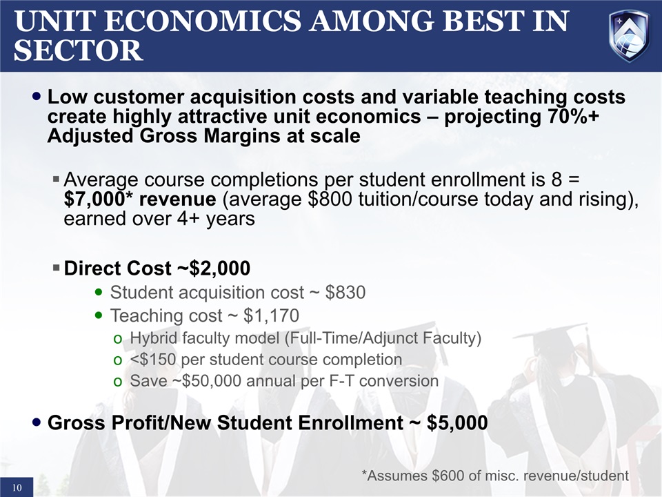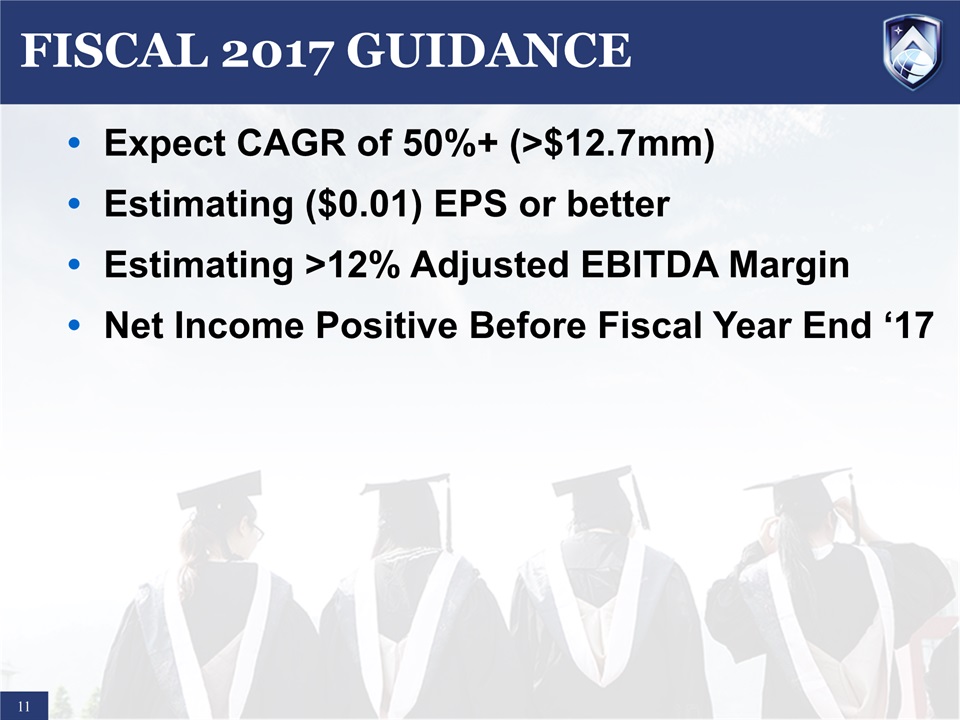 UNIT ECONOMICS AMONG BEST IN SECTOR  10  Low customer acquisition costs and variable teaching costs create highly attractive unit economics – projecting 70%+ Adjusted Gross Margins at scaleAverage course completions per student enrollment is 8 = $7,000* revenue (average $800 tuition/course today and rising), earned over 4+ yearsDirect Cost ~$2,000Student acquisition cost ~ $830 Teaching cost ~ $1,170Hybrid faculty model (Full-Time/Adjunct Faculty)<$150 per student course completionSave ~$50,000 annual per F-T conversionGross Profit/New Student Enrollment ~ $5,000 *Assumes $600 of misc. revenue/student