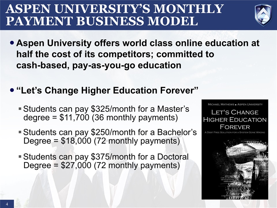 ASPEN UNIVERSITY DISRUPTING THE ONLINE FOR-PROFIT EDUCATION SECTOR  2  “Pay-As-You-Go”Monthly Payment Plans  Targeting the High-GrowthNursing Sector  Ability to Deliver Sub-$1,000 Enrollments at Scale  Aspen Among the Fasting GrowingUniversities in U.S.