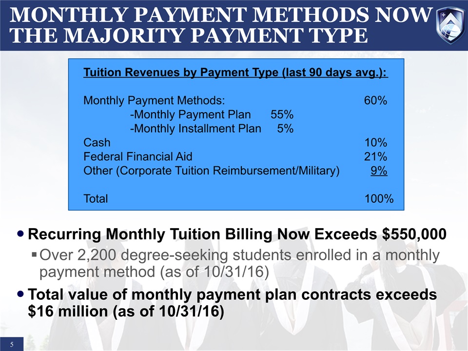 ASPEN UNIVERSITY’S MONTHLY PAYMENT BUSINESS MODEL  4  Aspen University offers world class online education at half the cost of its competitors; committed to cash-based, pay-as-you-go education“Let’s Change Higher Education Forever” Students can pay $325/month for a Master’s degree = $11,700 (36 monthly payments)Students can pay $250/month for a Bachelor’s Degree = $18,000 (72 monthly payments)Students can pay $375/month for a Doctoral Degree = $27,000 (72 monthly payments)