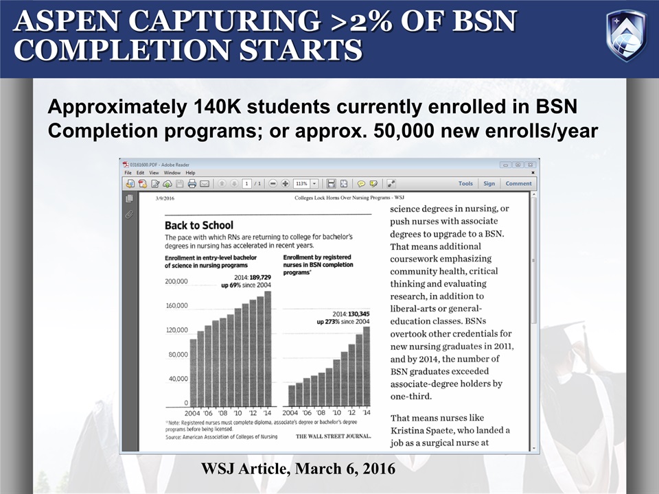 ASPEN CAPTURING >2% OF BSN COMPLETION STARTS  WSJ Article, March 6, 2016  Approximately 140K students currently enrolled in BSN Completion programs; or approx. 50,000 new enrolls/year