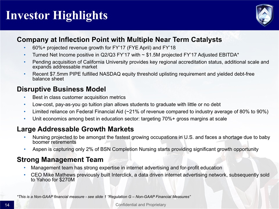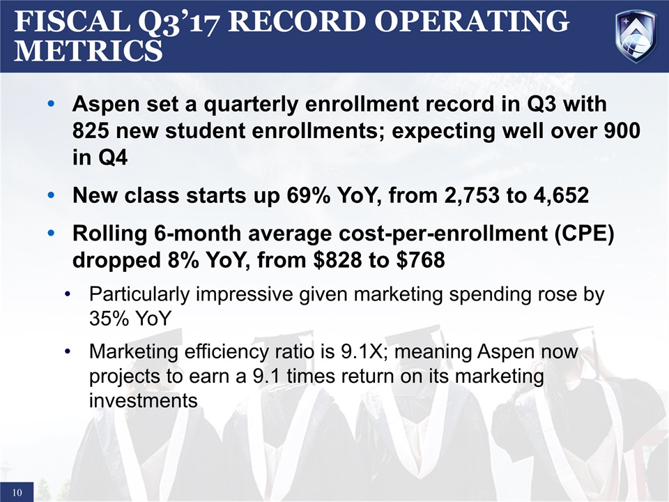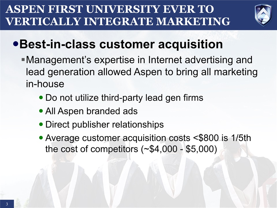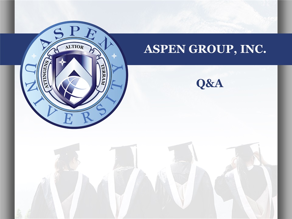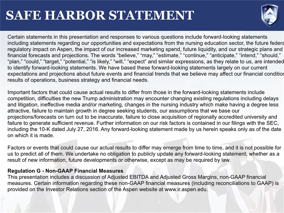 SAFE HARBOR STATEMENT Certain statements in this presentation and responses to various questions include forward-looking statements including statements regarding our opportunities and expectations from the nursing education sector, the future federal regulatory impact on Aspen, the impact of our increased marketing spend, future liquidity, and our strategic plans and financial forecasts and projections. The words “believe,” “may,” “estimate,” “continue,” “anticipate,” “intend,” “should,” “plan,” “could,” “target,” “potential,” “is likely,” “will,” “expect” and similar expressions, as they relate to us, are intended to identify forward-looking statements. We have based these forward-looking statements largely on our current expectations and projections about future events and financial trends that we believe may affect our financial condition, results of operations, business strategy and financial needs. Important factors that could cause actual results to differ from those in the forward-looking statements include competition, difficulties the new Trump administration may encounter changing existing regulations including delays and litigation, ineffective media and/or marketing, changes in the nursing industry which make having a degree less attractive, failure to maintain growth in degree seeking students, our assumptions that we base our projections/forecasts on turn out to be inaccurate, failure to close acquisition of regionally accredited university and failure to generate sufficient revenue. Further information on our risk factors is contained in our filings with the SEC, including the 10-K dated July 27, 2016. Any forward-looking statement made by us herein speaks only as of the date on which it is made. Factors or events that could cause our actual results to differ may emerge from time to time, and it is not possible for us to predict all of them. We undertake no obligation to publicly update any forward-looking statement, whether as a result of new information, future developments or otherwise, except as may be required by law.Regulation G - Non-GAAP Financial Measures This presentation includes a discussion of Adjusted EBITDA and Adjusted Gross Margins, non-GAAP financial measures. Certain information regarding these non-GAAP financial measures (including reconciliations to GAAP) is provided on the Investor Relations section of the Aspen website at www.ir.aspen.edu.