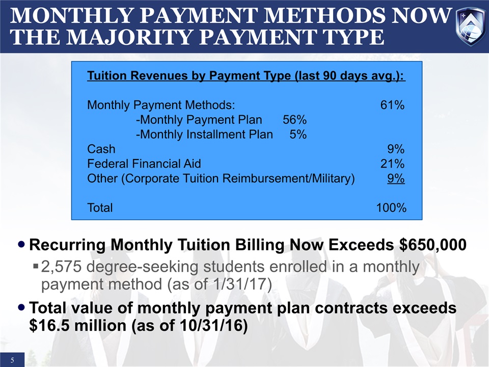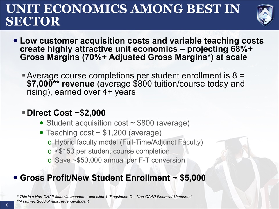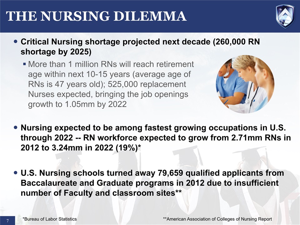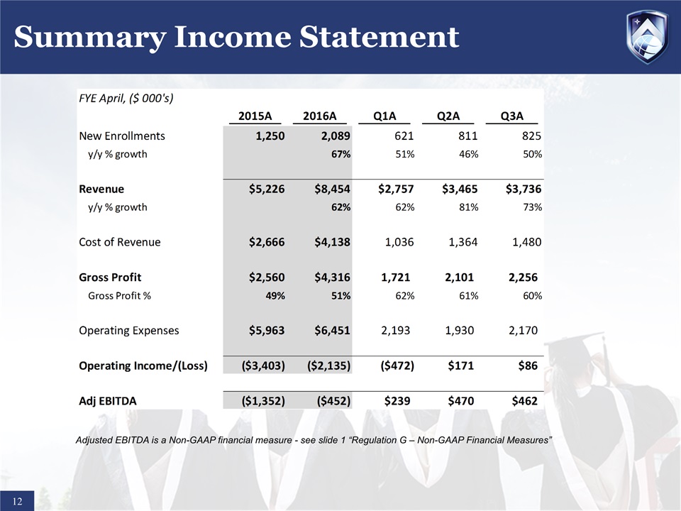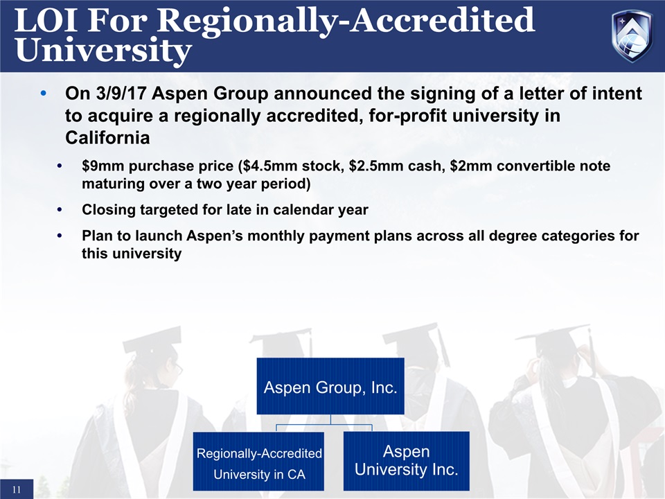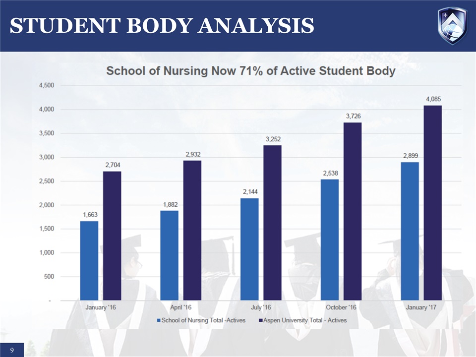 SAFE HARBOR STATEMENT Certain statements in this presentation and responses to various questions include forward-looking statements including statements regarding our opportunities and expectations from the nursing education sector, the future federal regulatory impact on Aspen, the impact of our increased marketing spend, future liquidity, and our strategic plans and financial forecasts and projections. The words “believe,” “may,” “estimate,” “continue,” “anticipate,” “intend,” “should,” “plan,” “could,” “target,” “potential,” “is likely,” “will,” “expect” and similar expressions, as they relate to us, are intended to identify forward-looking statements. We have based these forward-looking statements largely on our current expectations and projections about future events and financial trends that we believe may affect our financial condition, results of operations, business strategy and financial needs. Important factors that could cause actual results to differ from those in the forward-looking statements include competition, difficulties the new Trump administration may encounter changing existing regulations including delays and litigation, ineffective media and/or marketing, changes in the nursing industry which make having a degree less attractive, failure to maintain growth in degree seeking students, our assumptions that we base our projections/forecasts on turn out to be inaccurate, failure to close acquisition of regionally accredited university and failure to generate sufficient revenue. Further information on our risk factors is contained in our filings with the SEC, including the 10-K dated July 27, 2016. Any forward-looking statement made by us herein speaks only as of the date on which it is made. Factors or events that could cause our actual results to differ may emerge from time to time, and it is not possible for us to predict all of them. We undertake no obligation to publicly update any forward-looking statement, whether as a result of new information, future developments or otherwise, except as may be required by law.Regulation G - Non-GAAP Financial Measures This presentation includes a discussion of Adjusted EBITDA and Adjusted Gross Margins, non-GAAP financial measures. Certain information regarding these non-GAAP financial measures (including reconciliations to GAAP) is provided on the Investor Relations section of the Aspen website at www.ir.aspen.edu.