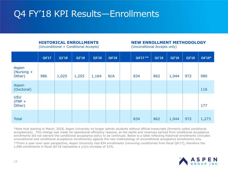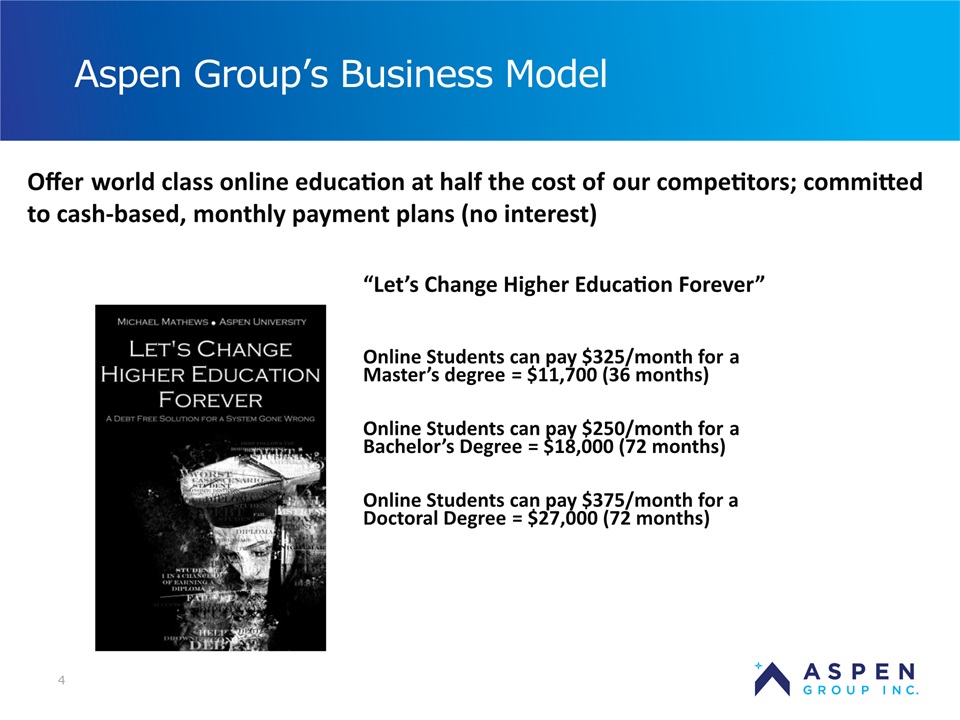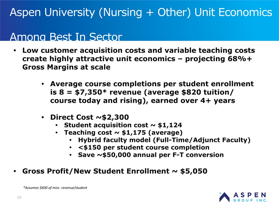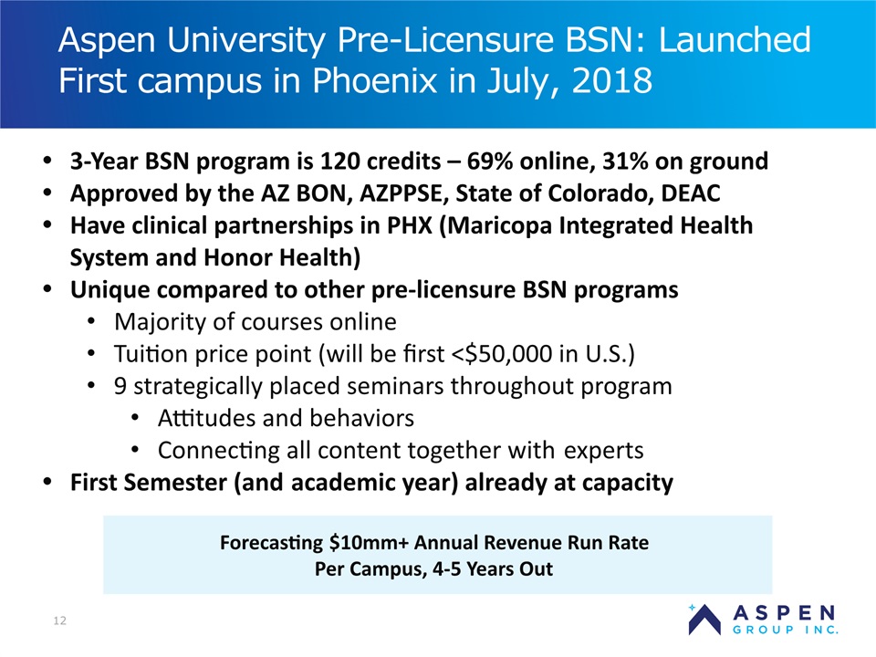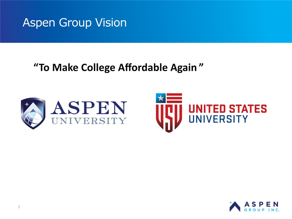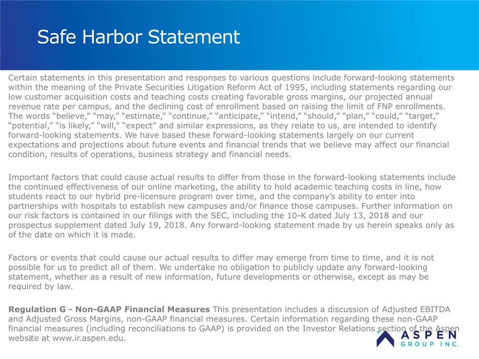 2 Certain statements in this presentation and responses to various questions include forward-looking statements within the meaning of the Private Securities Litigation Reform Act of 1995, including statements regarding our low customer acquisition costs and teaching costs creating favorable gross margins, our projected annual revenue rate per campus, and the declining cost of enrollment based on raising the limit of FNP enrollments. The words “believe,” “may,” “estimate,” “continue,” “anticipate,” “intend,” “should,” “plan,” “could,” “target,” “potential,” “is likely,” “will,” “expect” and similar expressions, as they relate to us, are intended to identify forward-looking statements. We have based these forward-looking statements largely on our current expectations and projections about future events and financial trends that we believe may affect our financial condition, results of operations, business strategy and financial needs. Important factors that could cause actual results to differ from those in the forward-looking statements include the continued effectiveness of our online marketing, the ability to hold academic teaching costs in line, how students react to our hybrid pre-licensure program over time, and the company’s ability to enter into partnerships with hospitals to establish new campuses and/or finance those campuses. Further information on our risk factors is contained in our filings with the SEC, including the 10-K dated July 13, 2018 and our prospectus supplement dated July 19, 2018. Any forward-looking statement made by us herein speaks only as of the date on which it is made. Factors or events that could cause our actual results to differ may emerge from time to time, and it is not possible for us to predict all of them. We undertake no obligation to publicly update any forward-looking statement, whether as a result of new information, future developments or otherwise, except as may be required by law. Regulation G - Non-GAAP Financial Measures This presentation includes a discussion of Adjusted EBITDA and Adjusted Gross Margins, non-GAAP financial measures. Certain information regarding these non-GAAP financial measures (including reconciliations to GAAP) is provided on the Investor Relations section of the Aspen website at www.ir.aspen.edu. Safe Harbor Statement