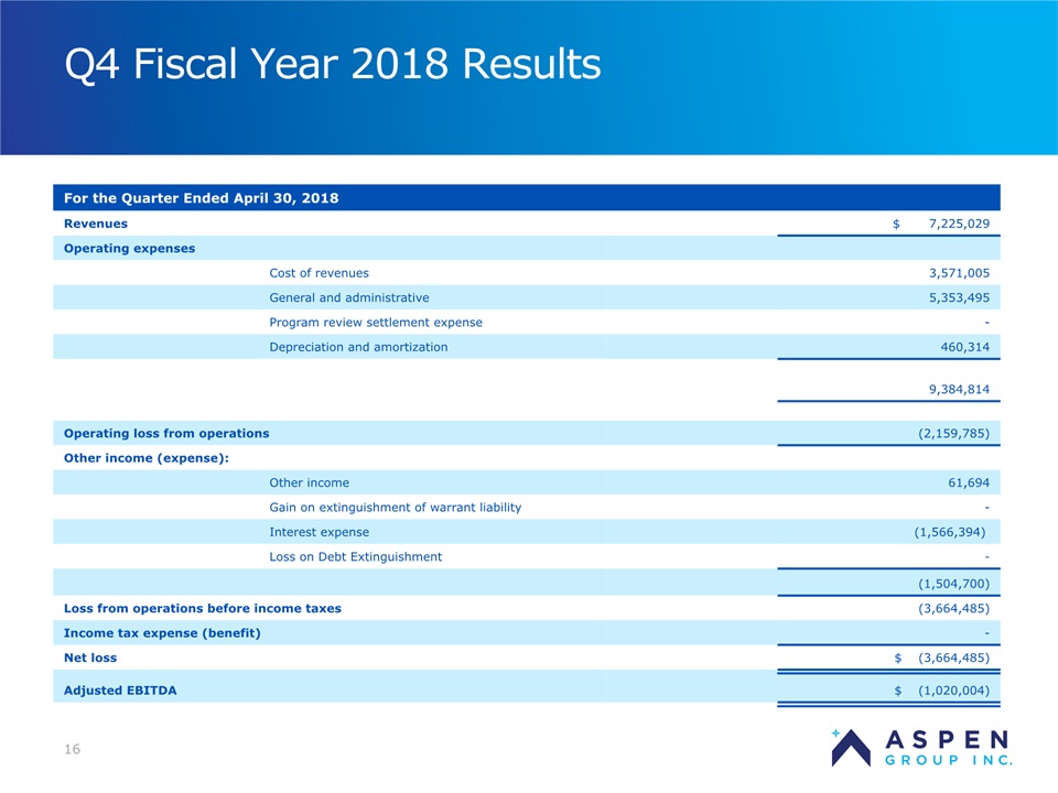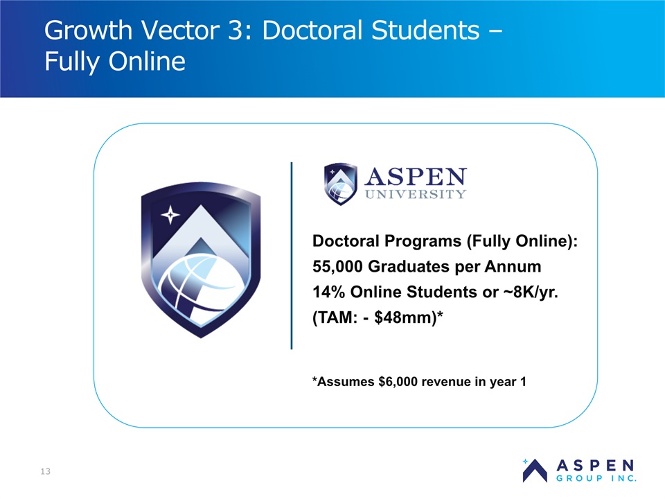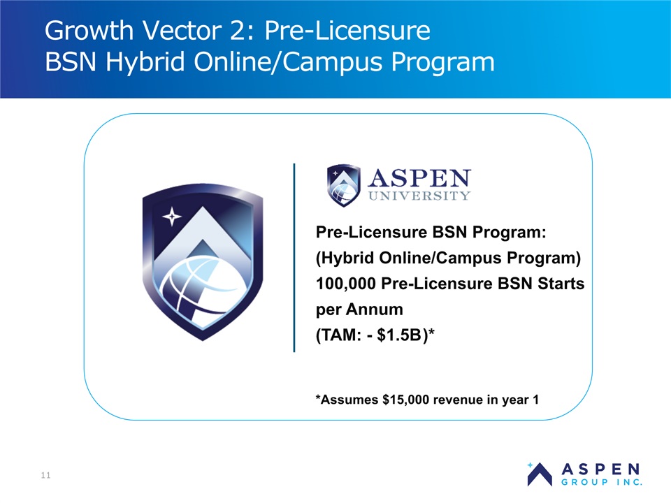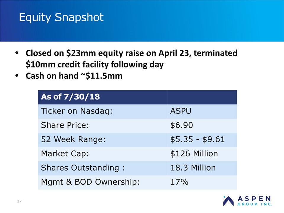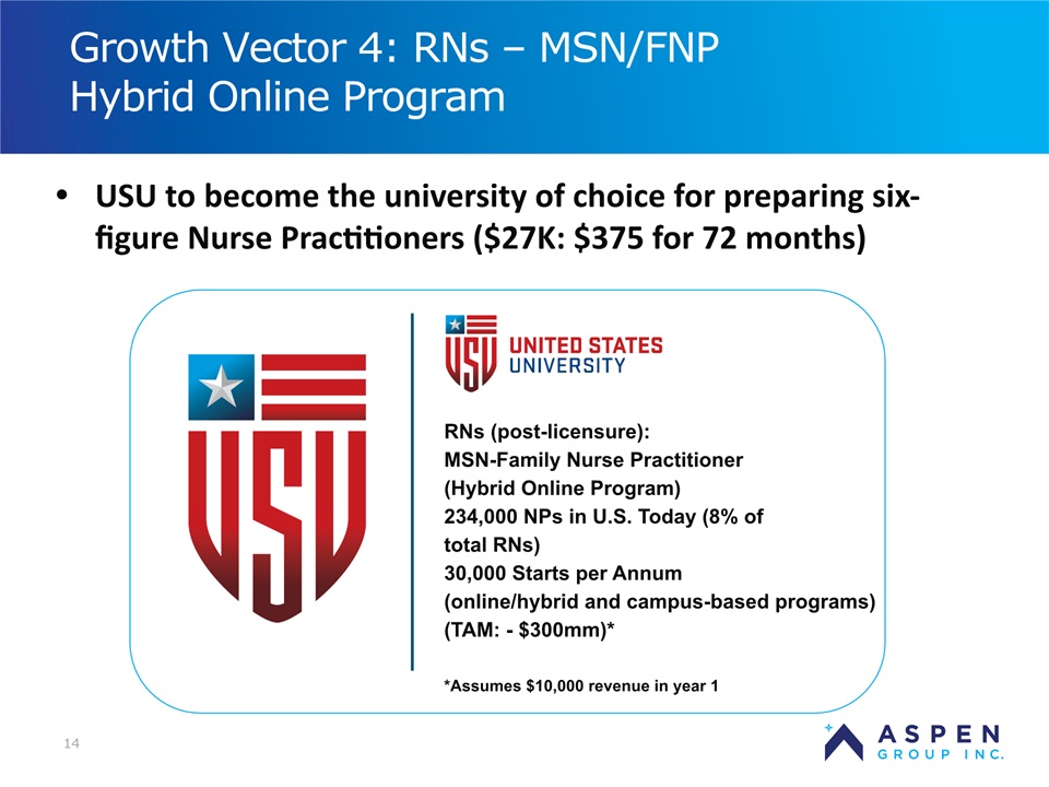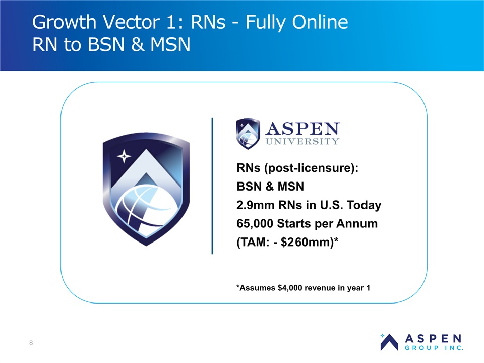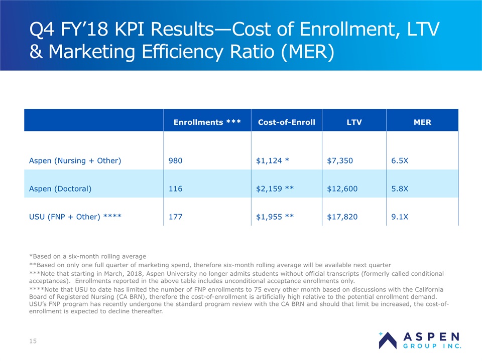 2 Certain statements in this presentation and responses to various questions include forward-looking statements within the meaning of the Private Securities Litigation Reform Act of 1995, including statements regarding our low customer acquisition costs and teaching costs creating favorable gross margins, our projected annual revenue rate per campus, and the declining cost of enrollment based on raising the limit of FNP enrollments. The words “believe,” “may,” “estimate,” “continue,” “anticipate,” “intend,” “should,” “plan,” “could,” “target,” “potential,” “is likely,” “will,” “expect” and similar expressions, as they relate to us, are intended to identify forward-looking statements. We have based these forward-looking statements largely on our current expectations and projections about future events and financial trends that we believe may affect our financial condition, results of operations, business strategy and financial needs. Important factors that could cause actual results to differ from those in the forward-looking statements include the continued effectiveness of our online marketing, the ability to hold academic teaching costs in line, how students react to our hybrid pre-licensure program over time, and the company’s ability to enter into partnerships with hospitals to establish new campuses and/or finance those campuses. Further information on our risk factors is contained in our filings with the SEC, including the 10-K dated July 13, 2018 and our prospectus supplement dated July 19, 2018. Any forward-looking statement made by us herein speaks only as of the date on which it is made. Factors or events that could cause our actual results to differ may emerge from time to time, and it is not possible for us to predict all of them. We undertake no obligation to publicly update any forward-looking statement, whether as a result of new information, future developments or otherwise, except as may be required by law. Regulation G - Non-GAAP Financial Measures This presentation includes a discussion of Adjusted EBITDA and Adjusted Gross Margins, non-GAAP financial measures. Certain information regarding these non-GAAP financial measures (including reconciliations to GAAP) is provided on the Investor Relations section of the Aspen website at www.ir.aspen.edu. Safe Harbor Statement