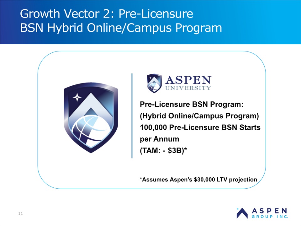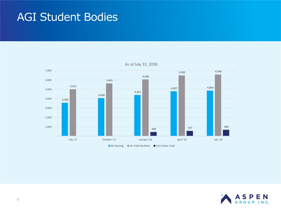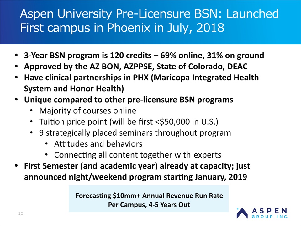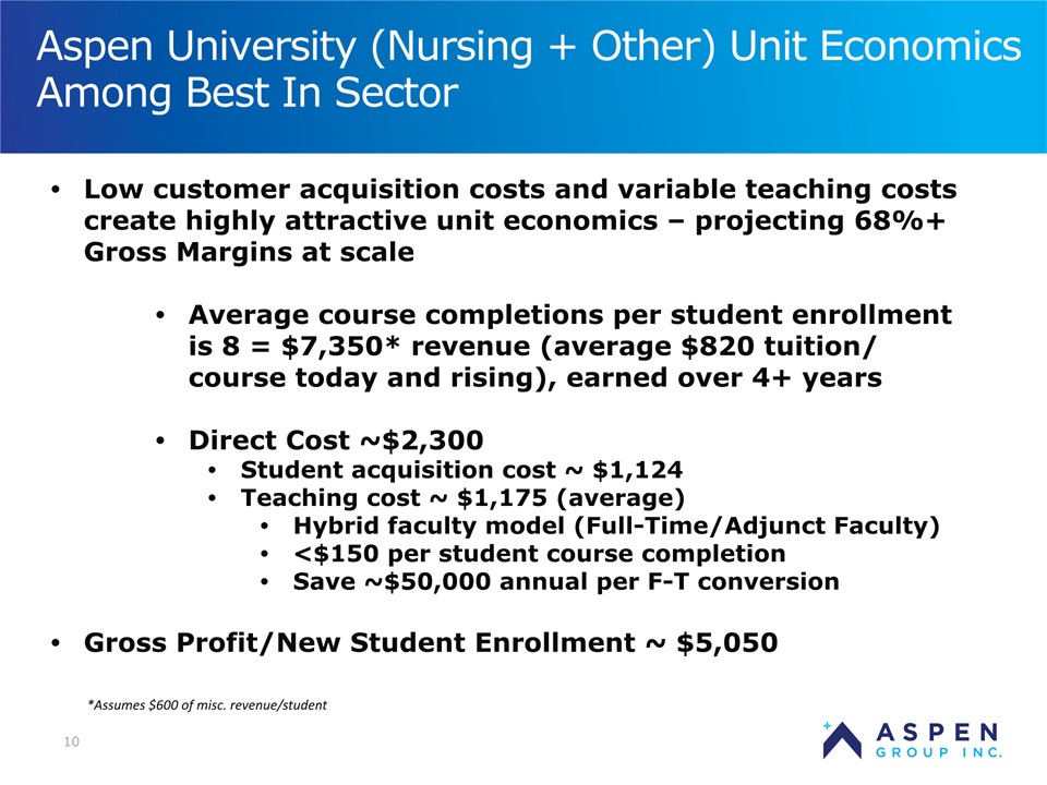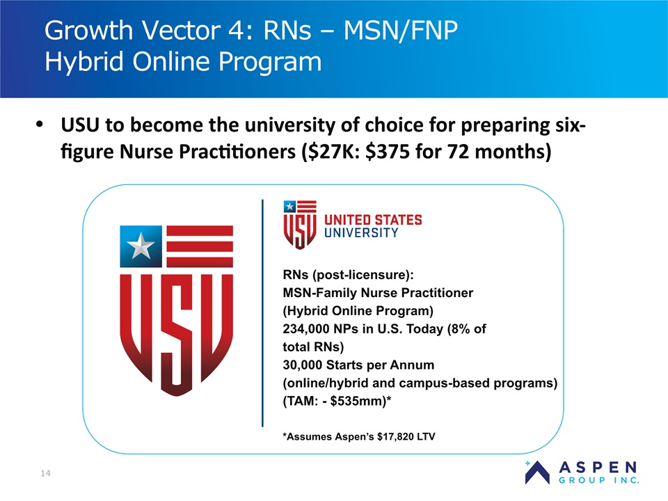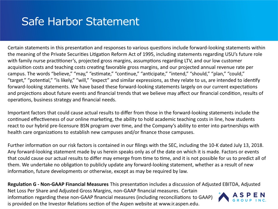 2 Safe Harbor Statement Certain statements in this presentation and responses to various questions include forward-looking statements within the meaning of the Private Securities Litigation Reform Act of 1995, including statements regarding USU’s future role with family nurse practitioner’s, projected gross margins, assumptions regarding LTV, and our low customer acquisition costs and teaching costs creating favorable gross margins, and our projected annual revenue rate per campus. The words “believe,” “may,” “estimate,” “continue,” “anticipate,” “intend,” “should,” “plan,” “could,” “target,” “potential,” “is likely,” “will,” “expect” and similar expressions, as they relate to us, are intended to identify forward-looking statements. We have based these forward-looking statements largely on our current expectations and projections about future events and financial trends that we believe may affect our financial condition, results of operations, business strategy and financial needs. Important factors that could cause actual results to differ from those in the forward-looking statements include the continued effectiveness of our online marketing, the ability to hold academic teaching costs in line, how students react to our hybrid pre-licensure BSN program over time, and the Company’s ability to enter into partnerships with health care organizations to establish new campuses and/or finance those campuses. Further information on our risk factors is contained in our filings with the SEC, including the 10-K dated July 13, 2018. Any forward-looking statement made by us herein speaks only as of the date on which it is made. Factors or events that could cause our actual results to differ may emerge from time to time, and it is not possible for us to predict all of them. We undertake no obligation to publicly update any forward-looking statement, whether as a result of new information, future developments or otherwise, except as may be required by law. Regulation G - Non-GAAP Financial Measures This presentation includes a discussion of Adjusted EBITDA, Adjusted Net Loss Per Share and Adjusted Gross Margins, non-GAAP financial measures. Certaininformation regarding these non-GAAP financial measures (including reconciliations to GAAP)is provided on the Investor Relations section of the Aspen website at www.ir.aspen.edu.