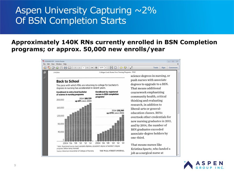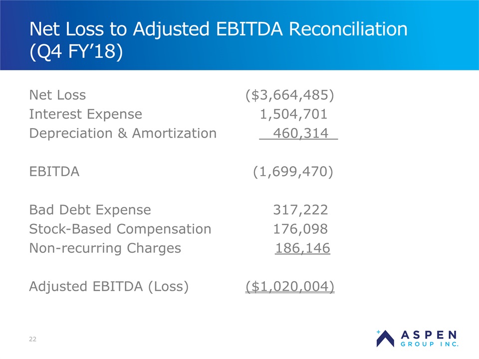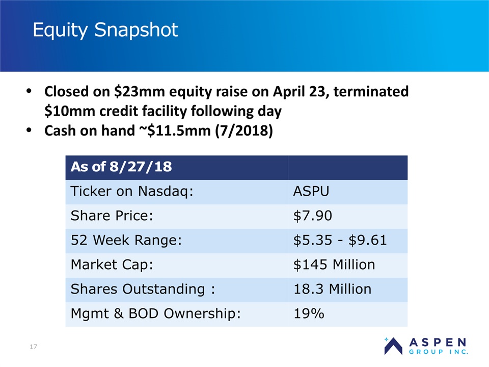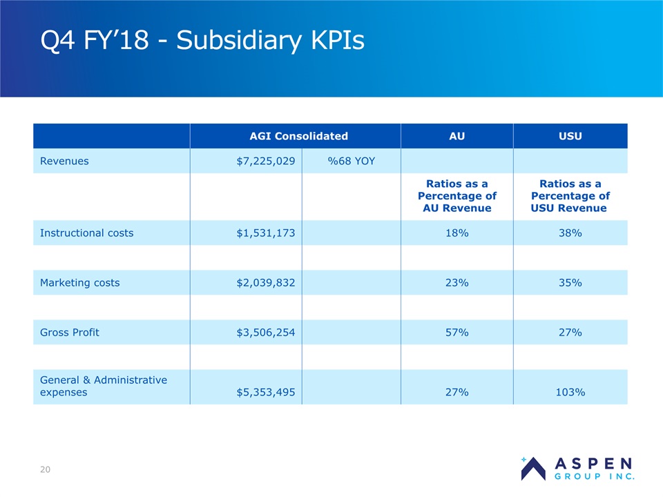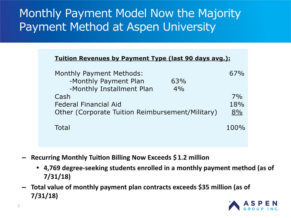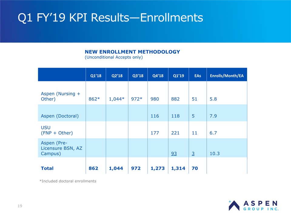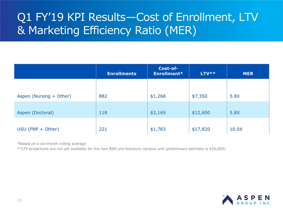 2 Safe Harbor Statement Certain statements in this presentation and responses to various questions include forward-looking statements within the meaning of the Private Securities Litigation Reform Act of 1995, including statements regarding USU’s future role with family nurse practitioner’s, projected gross margins, assumptions regarding LTV, and our low customer acquisition costs and teaching costs creating favorable gross margins, and our projected annual revenue rate per campus. The words “believe,” “may,” “estimate,” “continue,” “anticipate,” “intend,” “should,” “plan,” “could,” “target,” “potential,” “is likely,” “will,” “expect” and similar expressions, as they relate to us, are intended to identify forward-looking statements. We have based these forward-looking statements largely on our current expectations and projections about future events and financial trends that we believe may affect our financial condition, results of operations, business strategy and financial needs. Important factors that could cause actual results to differ from those in the forward-looking statements include the continued effectiveness of our online marketing, the ability to hold academic teaching costs in line, how students react to our hybrid pre-licensure BSN program over time, and the Company’s ability to enter into partnerships with health care organizations to establish new campuses and/or finance those campuses. Further information on our risk factors is contained in our filings with the SEC, including the 10-K dated July 13, 2018. Any forward-looking statement made by us herein speaks only as of the date on which it is made. Factors or events that could cause our actual results to differ may emerge from time to time, and it is not possible for us to predict all of them. We undertake no obligation to publicly update any forward-looking statement, whether as a result of new information, future developments or otherwise, except as may be required by law. Regulation G - Non-GAAP Financial Measures This presentation includes a discussion of Adjusted EBITDA, Adjusted Net Loss Per Share and Adjusted Gross Margins, non-GAAP financial measures. Certaininformation regarding these non-GAAP financial measures (including reconciliations to GAAP)is provided on the Investor Relations section of the Aspen website at www.ir.aspen.edu.