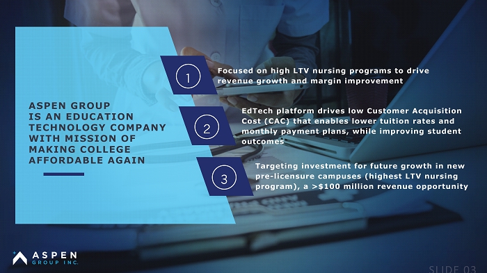 ASPEN GROUP IS AN EDUCATION TECHNOLOGY COMPANY WITH MISSION OF MAKING COLLEGE AFFORDABLE AGAIN Focused on high LTV nursing programs to drive revenue growth and margin improvement EdTech platform drives low Customer Acquisition Cost (CAC) that enables lower tuition rates and monthly payment plans, while improving student outcomes Targeting investment for future growth in new pre - licensure campuses (highest LTV nursing program), a >$100 million revenue opportunity 1 2 3