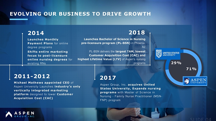 2014 Launches Monthly Payment Plans for online degree programs Shifts entire marketing focus to post - licensure online nursing degrees for existing RNs 2018 Launches Bachelor of Science in Nursing pre - licensure program (PL - BSN) in Phoenix, AZ PL - BSN delivers the largest TAM, lowest Customer Acquisition Cost (CAC) and highest Lifetime Value (LTV) of Aspen ’ s nursing programs 2017 Aspen Group, Inc. acquires United States University, Expands nursing programs with Master of Science in Nursing - Family Nurse Practitioner (MSN - FNP) program 2011 - 2012 Michael Mathews appointed CEO of Aspen University Launches industry’s only vertically integrated marketing platform designed to lower Customer Acquisition Cost (CAC) 29% 71% EVOLVING OUR BUSINESS TO DRIVE GROWTH