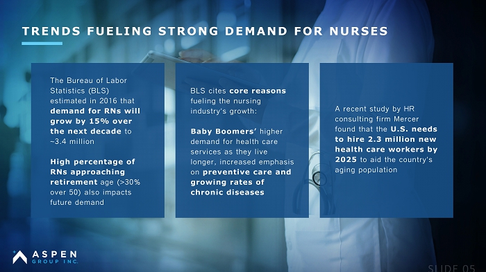 TRENDS FUELING STRONG DEMAND FOR NURSES The Bureau of Labor Statistics (BLS) estimated in 2016 that demand for RNs will grow by 15% over the next decade to ~3.4 million High percentage of RNs approaching retirement age (>30% over 50) also impacts future demand BLS cites core reasons fueling the nursing industry ’ s growth: Baby Boomers’ higher demand for health care services as they live longer, increased emphasis on preventive care and growing rates of chronic diseases A recent study by HR consulting firm Mercer found that the U.S. needs to hire 2.3 million new health care workers by 2025 to aid the country ’ s aging population