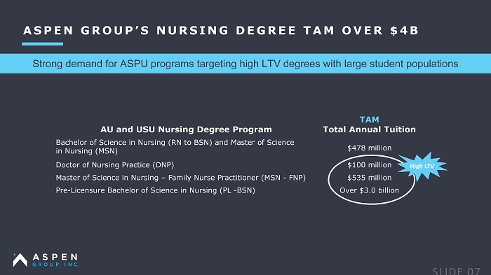 AU and USU Nursing Degree Program TAM Total Annual Tuition Bachelor of Science in Nursing (RN to BSN) and Master of Science in Nursing (MSN) $478 million Doctor of Nursing Practice (DNP) $100 million Master of Science in Nursing – Family Nurse Practitioner (MS N - FNP) $535 million Pre - Licensure Bachelor of Science in Nursing (PL - BSN) Over $3.0 billion High LTV ASPEN GROUP’S NURSING DEGREE TAM OVER $4B Strong demand for ASPU programs targeting high LTV degrees with large student populations