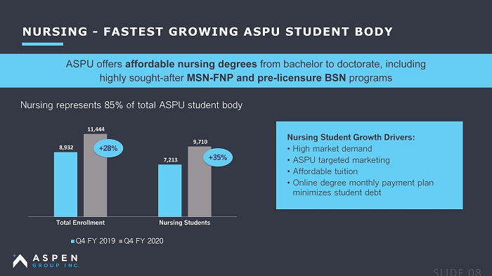 NURSING - FASTEST GROWING ASPU STUDENT BODY 8,932 7,213 11,444 9,710 Total Enrollment Nursing Students Q4 FY 2019 Q4 FY 2020 +35% +28% ASPU offers affordable nursing degrees from bachelor to doctorate, including highly sought - after MSN - FNP and pre - licensure BSN programs Nursing Student Growth Drivers: • High market demand • ASPU targeted marketing • Affordable tuition • Online degree monthly payment plan minimizes student debt Nursing represents 85% of total ASPU student body