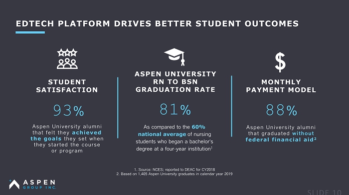 EDTECH PLATFORM DRIVES BETTER STUDENT OUTCOMES STUDENT SATISFACTION Aspen University alumni that felt they achieved the goals they set when they started the course or program MONTHLY PAYMENT MODEL Aspen University alumni that graduated without federal financial aid 2 93 % 88 % As compared to the 60% national average of nursing students who began a bachelor ’ s degree at a four - year institution 1 ASPEN UNIVERSITY RN TO BSN GRADUATION RATE 81 % $ 1. Source: NCES; reported to DEAC for CY2018 2. Based on 1,405 Aspen University graduates in calendar year 2019