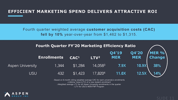 EFFICIENT MARKETING SPEND DELIVERS ATTRACTIVE ROI Fourth quarter weighted average customer acquisition costs (CAC) fell by 10% year - over - year from $1,462 to $1,315. 1 Based on 6 - month rolling weighted average CAC for each university ’ s enrollments 2 Lifetime Value (LTV) of a new student enrollment 3 Weighted average LTV for all Aspen University enrollments in the quarter 4 LTV for USU ’ s MSN - FNP Program Fourth Quarter FY’20 Marketing Efficiency Ratio Enrollments CAC 1 LTV 2 Q4’19 MER Q4’20 MER MER % Change Aspen University 1,344 $1,284 14,058 3 7.9X 10.9X 38% USU 432 $1,423 17,820 4 11.0X 12.5X 14%