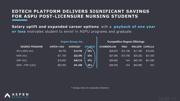 EDTECH PLATFORM DELIVERS SIGNIFICANT SAVINGS FOR ASPU POST - LICENSURE NURSING STUDENTS Salary uplift and expanded career options with a payback of one year or less motivates student to enroll in ASPU programs and graduate Aspen Group, Inc. Competitive Degree Offerings DEGREE PROGRAM ASPEN / USU AVERAGE* SAVINGS CHAMBERLAIN WGU WALDEN CAPELLA RN to BSN (AU) $9,750 $19,709 49% $28,870 $14,180 $17,785 $18,000 MSN (AU) $11,700 $22,395 52% $27,480 $15,780 $25,320 $21,000 DNP (AU) $18,900 $40,510 47% $39,660 N/A $40,790 $41,080 MSN – FNP (USU) $23,250 $41,208 56% $ 39,435 N/A $42,980 N/A * Average tuition of comparable institutions