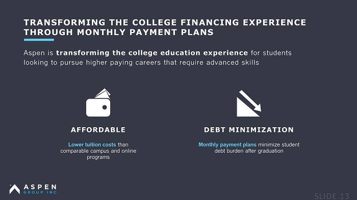 TRANSFORMING THE COLLEGE FINANCING EXPERIENCE THROUGH MONTHLY PAYMENT PLANS Aspen is transforming the college education experience for students looking to pursue higher paying careers that require advanced skills AFFORDABLE Lower tuition costs than comparable campus and online programs DEBT MINIMIZATION Monthly payment plans minimize student debt burden after graduation