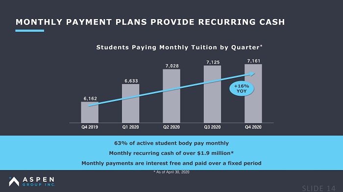 MONTHLY PAYMENT PLANS PROVIDE RECURRING CASH 63% of active student body pay monthly Monthly recurring cash of over $1.9 million* Monthly payments are interest free and paid over a fixed period 6,162 6,633 7,028 7,125 7,161 Q4 2019 Q1 2020 Q2 2020 Q3 2020 Q4 2020 Students Paying Monthly Tuition by Quarter * + 16 % YOY * As of April 30, 2020