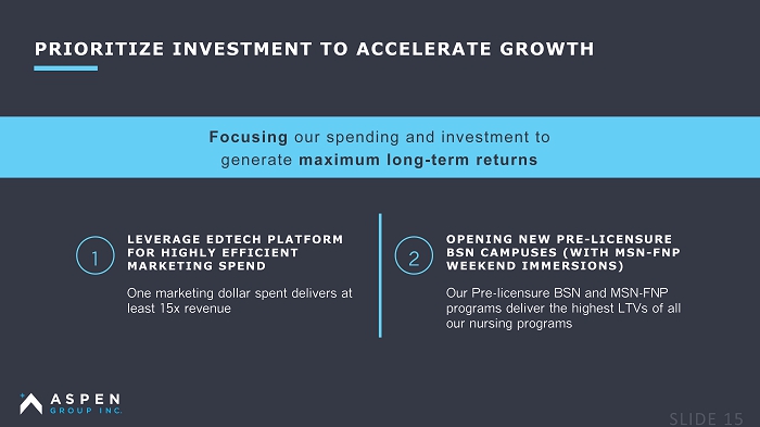 Focusing our spending and investment to generate maximum long - term returns OPENING NEW PRE - LICENSURE BSN CAMPUSES (WITH MSN - FNP WEEKEND IMMERSIONS) Our Pre - licensure BSN and MSN - FNP programs deliver the highest LTVs of all our nursing programs LEVERAGE EDTECH PLATFORM FOR HIGHLY EFFICIENT MARKETING SPEND One marketing dollar spent delivers at least 15x revenue PRIORITIZE INVESTMENT TO ACCELERATE GROWTH 1 2