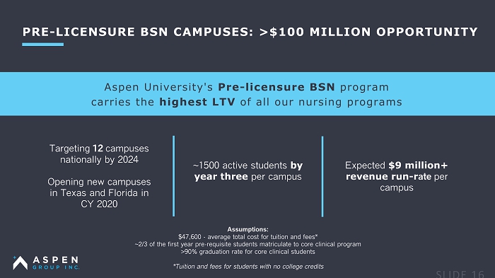 Aspen University's Pre - licensure BSN program carries the highest LTV of all our nursing programs Targeting 12 campuses nationally by 2024 Opening new campuses in Texas and Florida in CY 2020 PRE - LICENSURE BSN CAMPUSES: >$100 MILLION OPPORTUNITY ~1500 active students by year three per campus Expected $9 million+ revenue run - r ate per campus Assumptions: $47,600 - average total cost for tuition and fees* ~2/3 of the first year pre - requisite students matriculate to core clinical program >90% graduation rate for core clinical students *Tuition and fees for students with no college credits