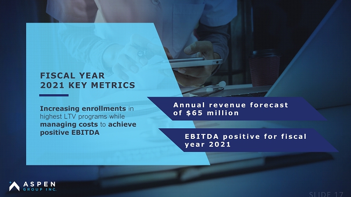 FISCAL YEAR 2021 KEY METRICS Increasing enrollments in highest LTV programs while managing costs to achieve positive EBITDA Annual revenue forecast of $65 million EBITDA positive for fiscal year 2021