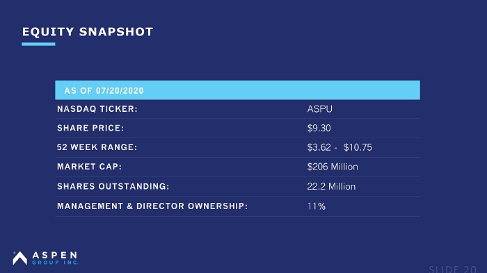 EQUITY SNAPSHOT AS OF 07/20/2020 NASDAQ TICKER: ASPU SHARE PRICE: $9.30 52 WEEK RANGE: $3.62 - $10.75 MARKET CAP: $206 Million SHARES OUTSTANDING: 22.2 Million MANAGEMENT & DIRECTOR OWNERSHIP: 11%