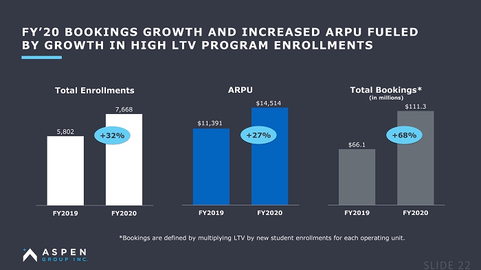 FY’20 BOOKINGS GROWTH AND INCREASED ARPU FUELED BY GROWTH IN HIGH LTV PROGRAM ENROLLMENTS *Bookings are defined by multiplying LTV by new student enrollments for each operating unit. 5,802 7,668 FY2019 FY2020 Total Enrollments +32% $11,391 $14,514 FY2019 FY2020 ARPU +27% $66.1 $111.3 FY2019 FY2020 Total Bookings* (in millions) +68%