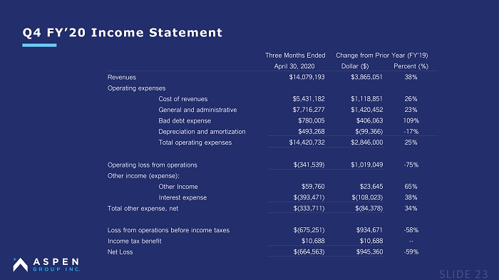 Q4 FY’20 Income Statement Three Months Ended Change from Prior Year (FY ’ 19) April 30, 2020 Dollar ($) Percent (%) Revenues $14,079,193 $3,865,051 38% Operating expenses Cost of revenues $5,431,182 $1,118,851 26% General and administrative $7,716,277 $1,420,452 23% Bad debt expense $780,005 $406,063 109% Depreciation and amortization $493,268 $(99,366) - 17% Total operating expenses $14,420,732 $2,846,000 25% Operating loss from operations $(341,539) $1,019,049 - 75% Other income (expense): Other Income $59,760 $23,645 65% Interest expense $(393,471) $(108,023) 38% Total other expense, net $(333,711) $(84,378) 34% Loss from operations before income taxes $(675,251) $934,671 - 58% Income tax benefit $10,688 $10,688 -- Net Loss $(664,563) $945,360 - 59%