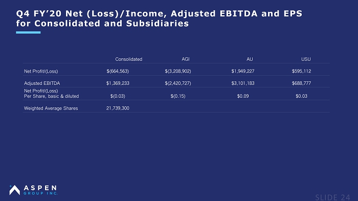 Q4 FY’20 Net (Loss)/Income, Adjusted EBITDA and EPS for Consolidated and Subsidiaries Consolidated AGI AU USU Net Profit/(Loss) $(664,563) $(3,208,902) $1,949,227 $595,112 Adjusted EBITDA $1,369,233 $(2,420,727) $3,101,183 $688,777 Net Profit/(Loss) Per Share, basic & diluted $(0.03) $(0.15) $0.09 $0.03 Weighted Average Shares 21,739,300