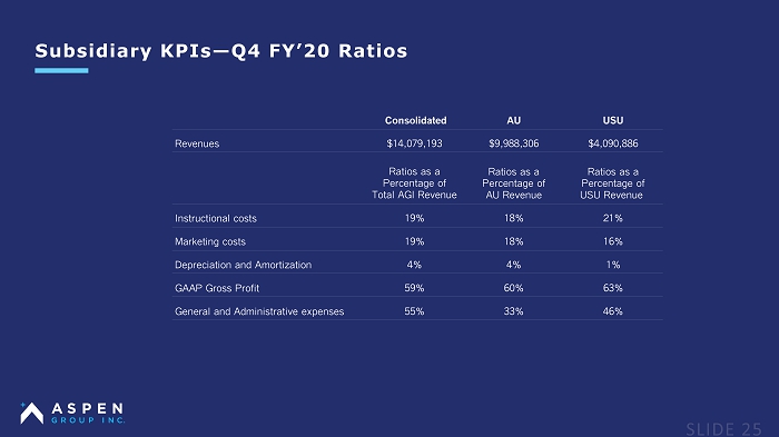 Subsidiary KPIs — Q4 FY’20 Ratios Consolidated AU USU Revenues $14,079,193 $9,988,306 $4,090,886 Ratios as a Percentage of Total AGI Revenue Ratios as a Percentage of AU Revenue Ratios as a Percentage of USU Revenue Instructional costs 19% 18% 21% Marketing costs 19% 18% 16% Depreciation and Amortization 4% 4% 1% GAAP Gross Profit 59% 60% 63% General and Administrative expenses 55% 33% 46%