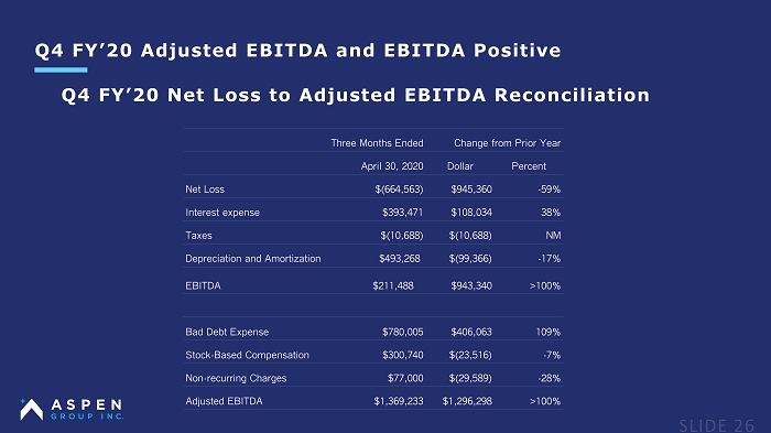 Q4 FY’20 Adjusted EBITDA and EBITDA Positive Three Months Ended Change from Prior Year April 30, 2020 Dollar Percent Net Loss $(664,563) $945,360 - 59% Interest expense $393,471 $108,034 38% Taxes $(10,688) $(10,688) NM Depreciation and Amortization $493,268 $(99,366) - 17% EBITDA $211,488 $943,340 >100% Bad Debt Expense $780,005 $406,063 109% Stock - Based Compensation $300,740 $(23,516) - 7% Non - recurring Charges $77,000 $(29,589) - 28% Adjusted EBITDA $1,369,233 $1,296,298 >100% Q4 FY’20 Net Loss to Adjusted EBITDA Reconciliation