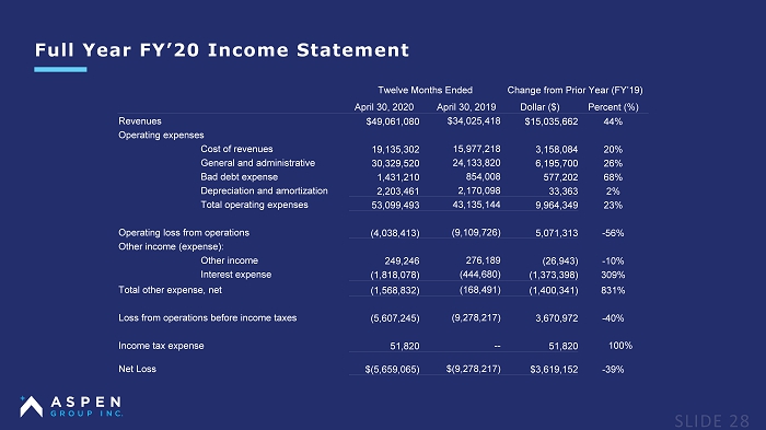 Full Year FY’20 Income Statement Twelve Months Ended Change from Prior Year (FY’19) April 30, 2020 April 30, 2019 Dollar ($) Percent (%) Revenues $49,061,080 $34,025,418 $15,035,662 44% Operating expenses Cost of revenues 19,135,302 15,977,218 3,158,084 20% General and administrative 30,329,520 24,133,820 6,195,700 26% Bad debt expense 1,431,210 854,008 577,202 68% Depreciation and amortization 2,203,461 2,170,098 33,363 2% Total operating expenses 53,099,493 43,135,144 9,964,349 23% Operating loss from operations (4,038,413) (9,109,726) 5,071,313 - 56% Other income (expense): Other income 249,246 276,189 (26,943) - 10% Interest expense (1,818,078) (444,680) (1,373,398) 309% Total other expense, net (1,568,832) (168,491) (1,400,341) 831% Loss from operations before income taxes (5,607,245) (9,278,217) 3,670,972 - 40% Income tax expense 51,820 -- 51,820 100% Net Loss $(5,659,065) $(9,278,217) $3,619,152 - 39%