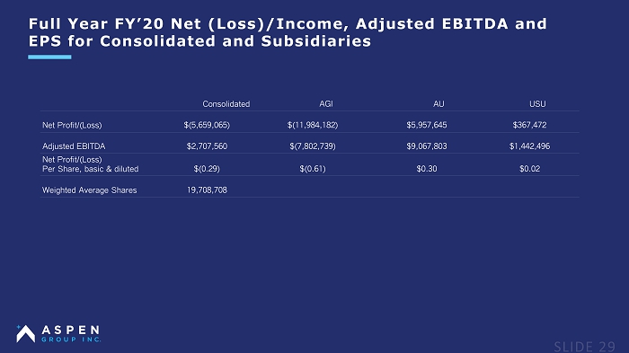 Full Year FY’20 Net (Loss)/Income, Adjusted EBITDA and EPS for Consolidated and Subsidiaries Consolidated AGI AU USU Net Profit/(Loss) $(5,659,065) $(11,984,182) $5,957,645 $367,472 Adjusted EBITDA $2,707,560 $(7,802,739) $9,067,803 $1,442,496 Net Profit/(Loss) Per Share, basic & diluted $(0.29) $(0.61) $0.30 $0.02 Weighted Average Shares 19,708,708