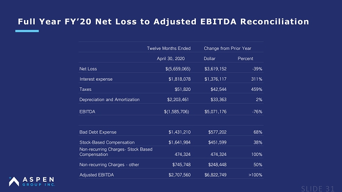 Twelve Months Ended Change from Prior Year April 30, 2020 Dollar Percent Net Loss $(5,659,065) $3,619,152 - 39% Interest expense $1,818,078 $1,376,117 311% Taxes $51,820 $42,544 459% Depreciation and Amortization $2,203,461 $33,36 3 2% EBITDA $(1,585,706) $5,0 71 , 176 - 76% Bad Debt Expense $1,431,210 $577,202 68% Stock - Based Compensation $1,641,984 $451,599 38% Non - recurring Charges - Stock Based Compensation 474,324 474,324 100% Non - recurring Charges - other $745,748 $248,448 50% Adjusted EBITDA $2,707,560 $6,822,749 >100% Full Year FY’20 Net Loss to Adjusted EBITDA Reconciliation