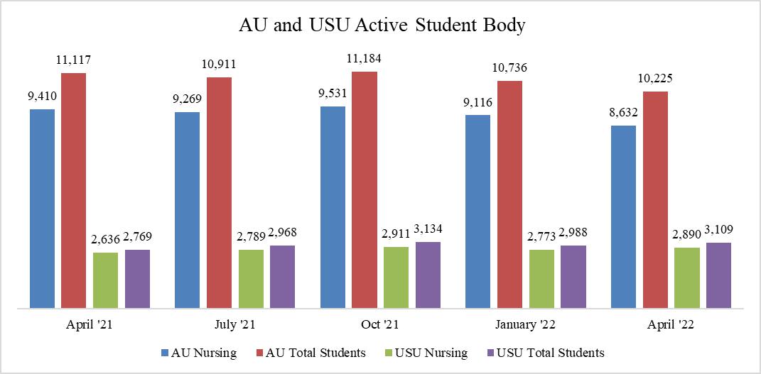 AGI's active degree-seeking student body at AU and USU, declined 4% year-over-year to 13,334 from 13,886. AU's total active student body decreased by 8% year-over-year to 10,225 from 11,117. On a year-over-year basis, USU's total active student body grew by 12% to 3,109 from 2,769. The chart below shows five quarters of active student body results.